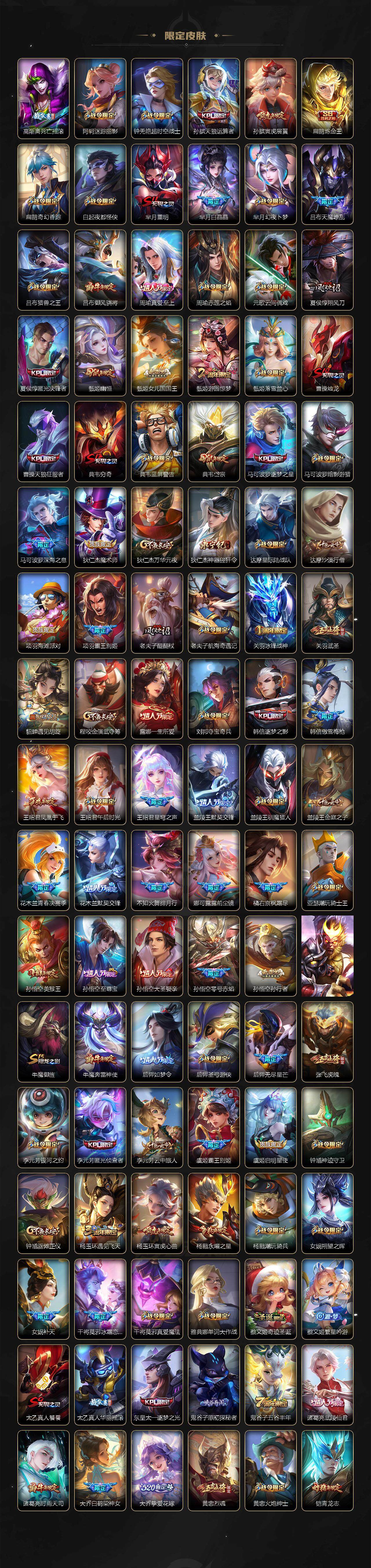【限定皮肤】:白起狰,虞姬夏日便利店,狄仁杰阴阳师,小乔纯白花嫁,虞姬凯尔特女王,廉颇寅虎御盾,赵云皇家上将,赵云引擎之心,赵云龙胆,赵云百木心枪,墨子神迹守卫,墨子降魔,妲己热情桑巴,妲己时之彼端,妲己时之奇旅,嬴政优雅恋人,嬴政白昼王子,孙尚香蔷薇恋人,孙尚香异界灵契,鲁班七号狮舞东方,鲁班七号乒乒小将,鲁班七号寅虎瑞焰,庄周云端筑梦师,庄周高山流水,高渐离死亡摇滚,阿轲迷踪丽影,钟无艳超时空战士,孙膑天狼运算者,孙膑寅虎展翼,扁鹊炼金王,扁鹊奇幻香踪,白起夜都怪侠,芈月重明,芈月白晶晶,芈月幻夜卜梦,吕布天魔缭乱,吕布猎兽之王,吕布御风骁将,周瑜真爱至上,周瑜赤莲之焰,元歌云间偶戏,夏侯惇朔风刀,夏侯惇匿光决锋者,甄姬幽恒,甄姬女儿国国王,甄姬游园惊梦,甄姬落雪兰心