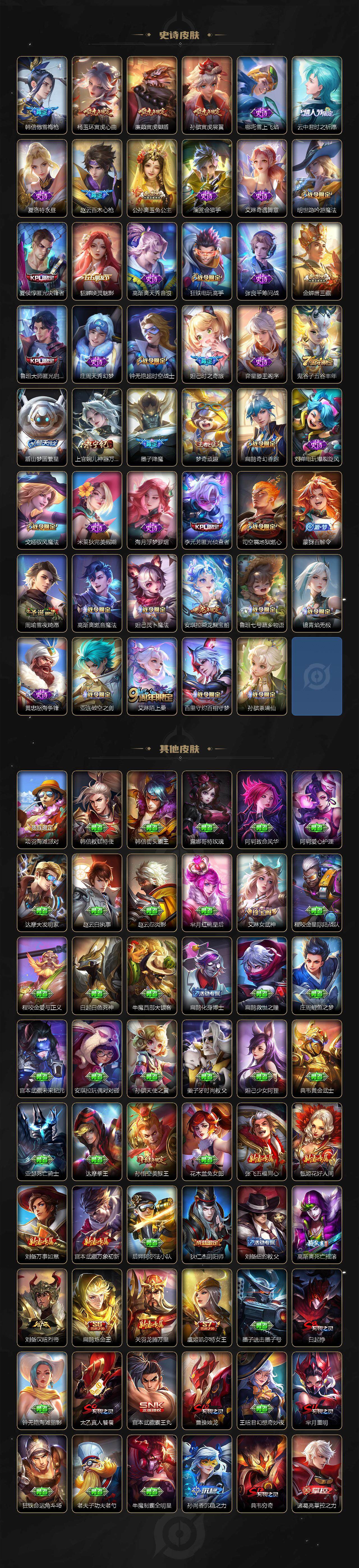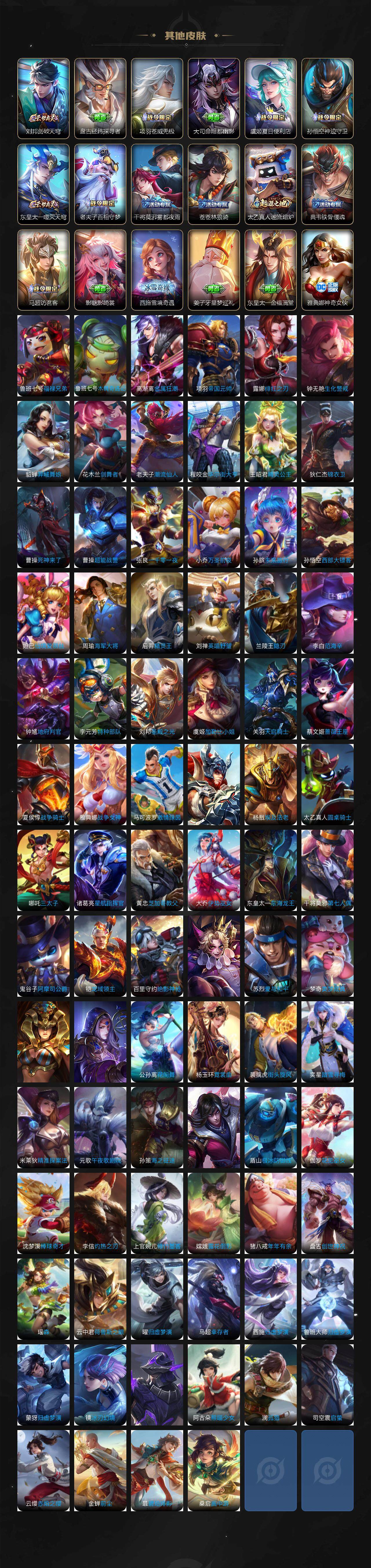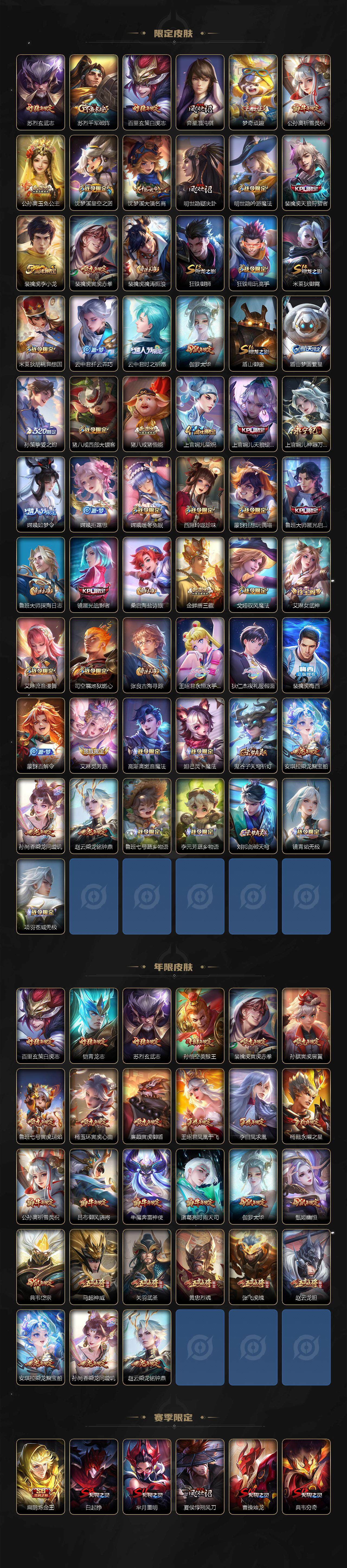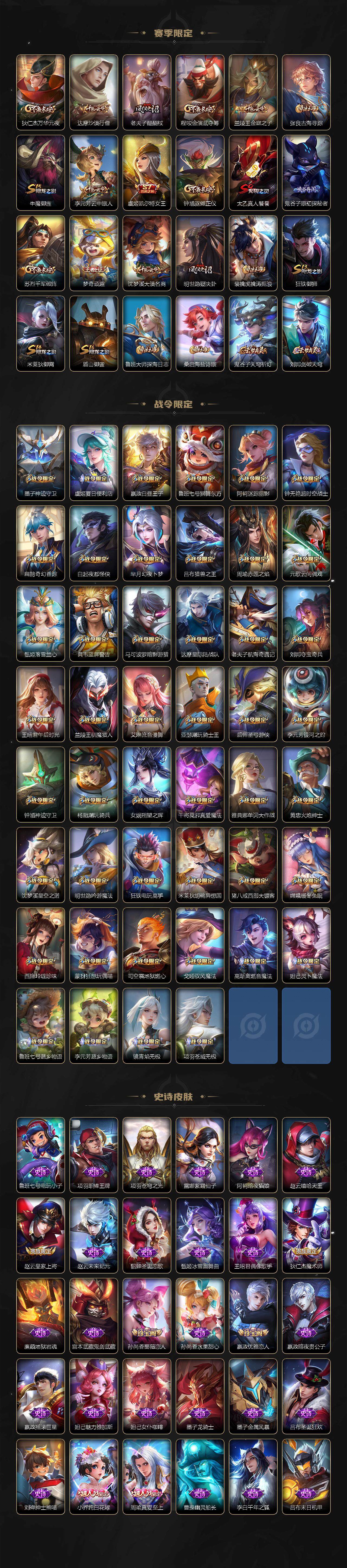 关羽冰锋战神,裴擒虎李小龙,上官婉儿梁祝,牛魔奔雷神使,公孙离祈雪灵祝,吕布御风骁将,诸葛亮时雨天司,赵云龙胆,关羽武圣,黄忠烈魂,张飞虎魄,马超神威,典韦岱宗,甄姬幽恒,伽罗太华,曹操天狼征服者,裴擒虎天狼狩猎者,孙膑天狼运算者,上官婉儿天狼绘梦者,马可波罗逐梦之星,韩信逐梦之影,东皇太一逐梦之光,铠青龙志,百里玄策白虎志,苏烈玄武志,王昭君凤凰于飞,项羽霸王别姬,虞姬霸王别姬,小乔纯白花嫁,周瑜真爱至上,孙悟空大圣娶亲,露娜一生所爱,花木兰默契交锋,兰陵王默契交锋,后羿如梦令,嫦娥如梦令,孙悟空至尊宝,裴擒虎梅西,雅典娜神奇女侠,妲己热情桑巴,干将莫邪冰霜恋舞曲,花木兰青春决赛季,蔡文姬奇迹圣诞,妲己时之彼端,芈月白晶晶,赵云引擎之心,孙悟空美猴王,庄周云端筑梦师,鲁班七号乒乒小将,大乔白鹤梁神女,猪八戒猪悟能,廉颇寅虎·御盾,孙尚香异界灵契,孙悟空孙行者,甄姬女儿国国王,镜匿光追影者,韩信傲雪梅枪,鲁班七号寅虎·瑞焰,孙膑寅虎·展翼,杨玉环寅虎·心曲,裴擒虎寅虎·赤拳,云中君时之祈愿,女娲补天,赵云百木心枪,公孙离玉兔公主,夏侯惇匿光决锋者,后羿无尽星芒,马可波罗深海之息,金蝉唐三藏,娜可露露前尘镜,橘右京枫霜尽,鲁班大师匿光启智者,妲己时之奇旅,王昭君星穹之声,不知火舞绯月行,上官婉儿神器·万象笔,盾山梦圆繁星,墨子降魔,李白诗剑行,桑启鸣野蒿,艾琳陌上桑