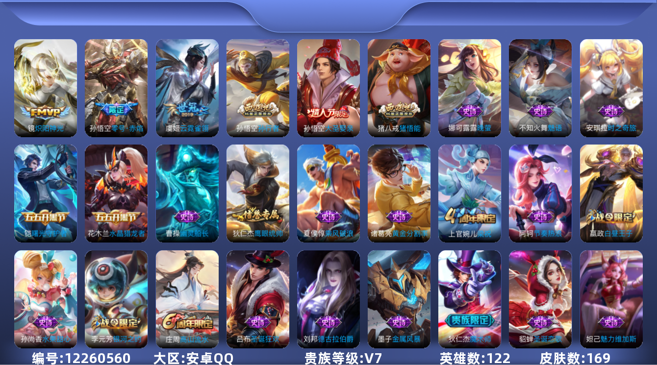 [12260560]V7 3传说 122英雄 169皮肤 可修改实名 优质装备:炽阳神光,云霓雀翎,零号·赤焰 限定皮:高山流水,梁祝,孙行者,猪悟能,大圣娶亲,美猴王 史诗皮:黄金分割率,魅语,晚萤,节奏热浪,水果甜心,时之奇旅-安琪拉,德古拉伯爵,幽灵船长,乘风破浪,水晶猎龙者,曙光守护者,金属风暴,圣诞狂欢,圣诞恋歌,鹰眼统帅,魅力维加斯
