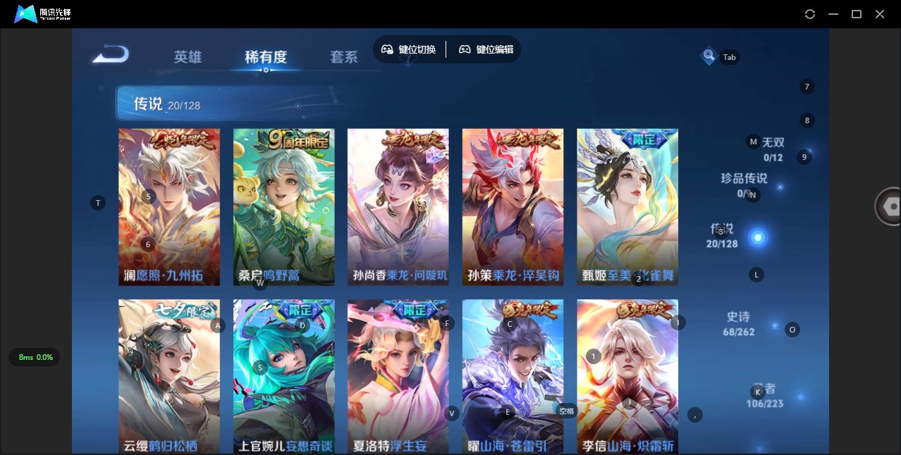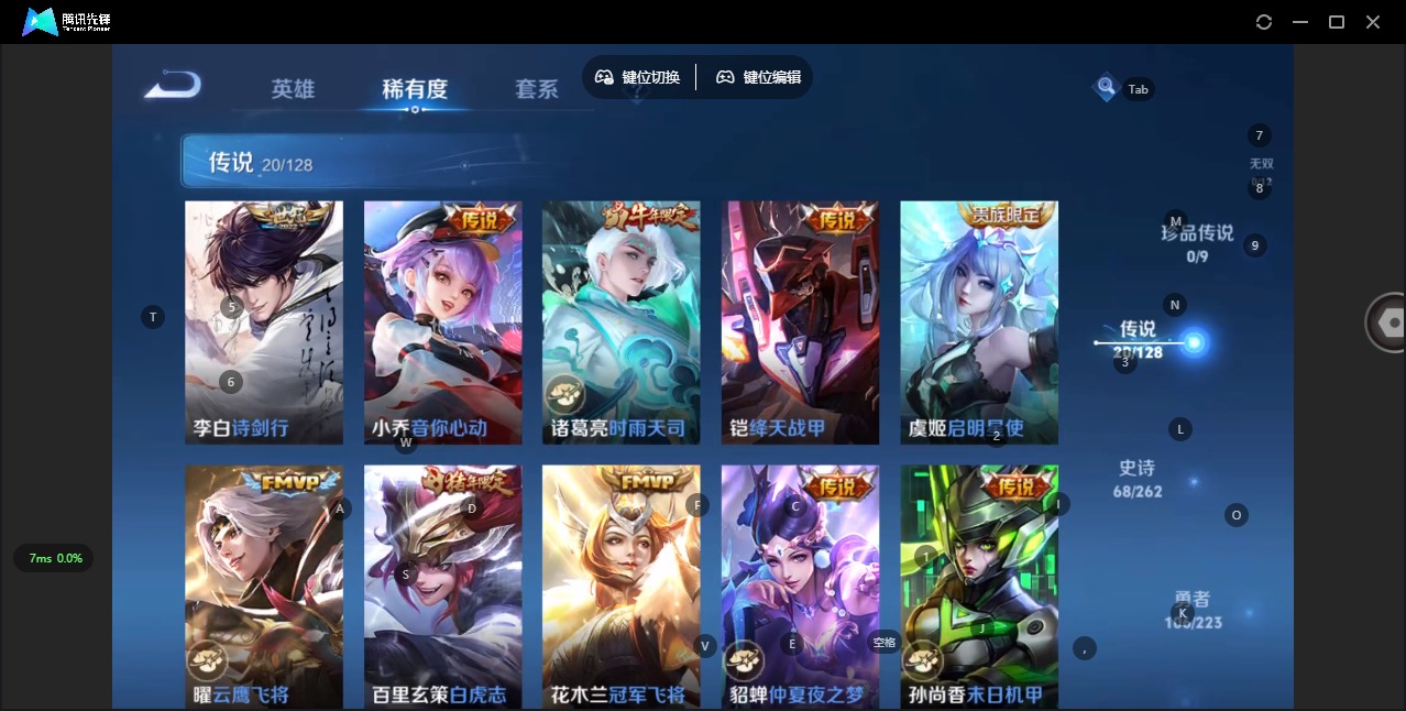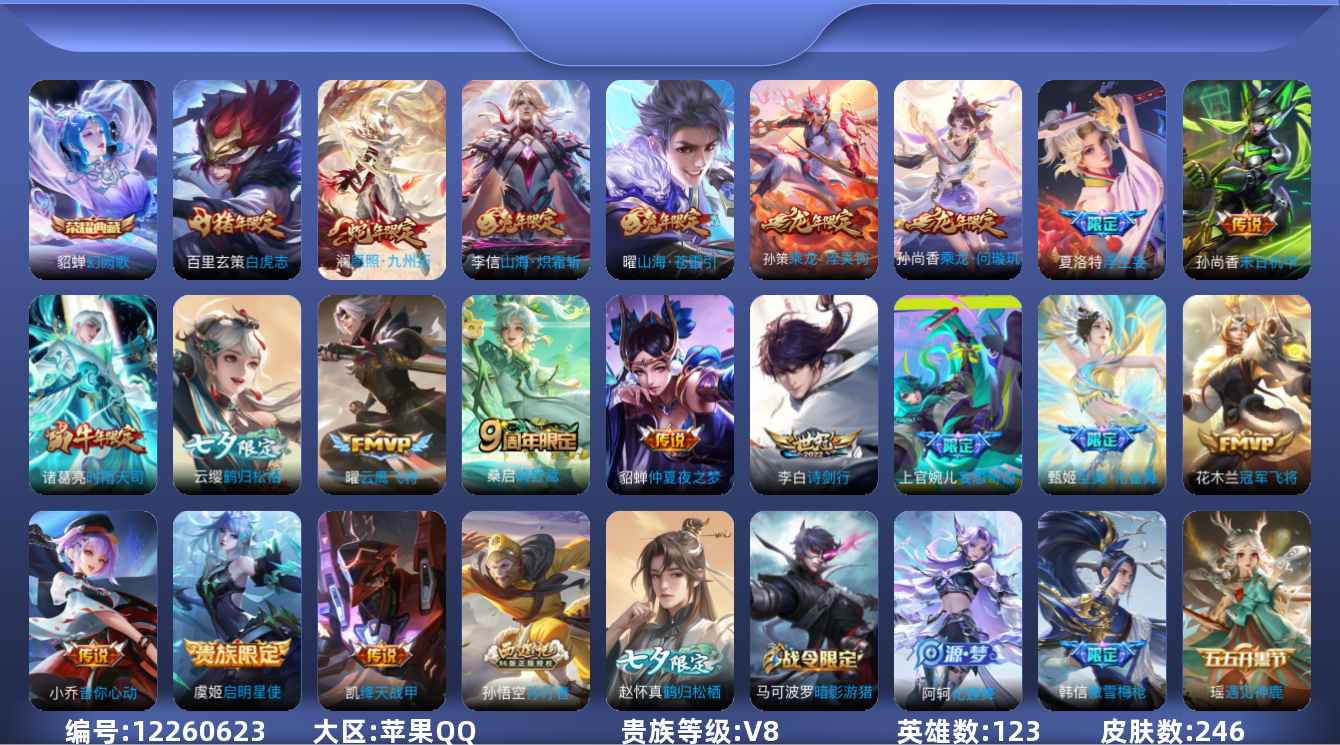 - [12233573]V8 3典藏 15传说 125英雄 227皮肤 可修改实名 优质装备:鸣剑·曳影,全息碎影(猴子典藏),银白咏叹调(倪克斯侍卫),云鹰飞将(小将军),一念神魔,仲夏夜之梦(大飞蛾),李逍遥,时之恋人-刘备(电焊工),淬星耀世,无双飞将,山海·炽霜斩(李信年限),灼幽烈阳,夜礼服假面 珍宝阁皮:胡桃夹子,蔷薇恋人 限定皮:凤求凰(白切鸡),异界灵契(白毛香),傲雪梅枪,高山流水,诗剑行,怒海麟威,五谷丰年,青龙志(铠年限),游园惊梦,李小龙,逐梦之影,辉光之辰,孙行者,青春决赛季,匿光追影者,山海·玄木吟(马可年限) 史诗皮:星界战将,东方月初,海诺心动手记,紫霞仙子,电玩小子(小书包),白龙吟,黄金分割率,特工魅影,千年之狐,江河有灵,蒙恬荣光圣徽,冰冠公主,青蛇,偶像歌手,暗夜猫娘,龙骑士(小龙虾),猫狗日记-孙策,乱世虎臣,节奏热浪,修罗,女仆咖啡,水果甜心,绅士熊喵,星夜王子,心灵骇客,时之奇旅-安琪拉,暗隐猎兽者,鬼剑武藏,心灵战警,舞动绿茵,拒霜思,缤纷独角兽,乘风破浪,逐浪之夏,水晶猎龙者,曙光守护者,金属风暴,原初追逐者,鹰眼统帅,黎明之约,赏金猎手,无心,未来纪元-赵云