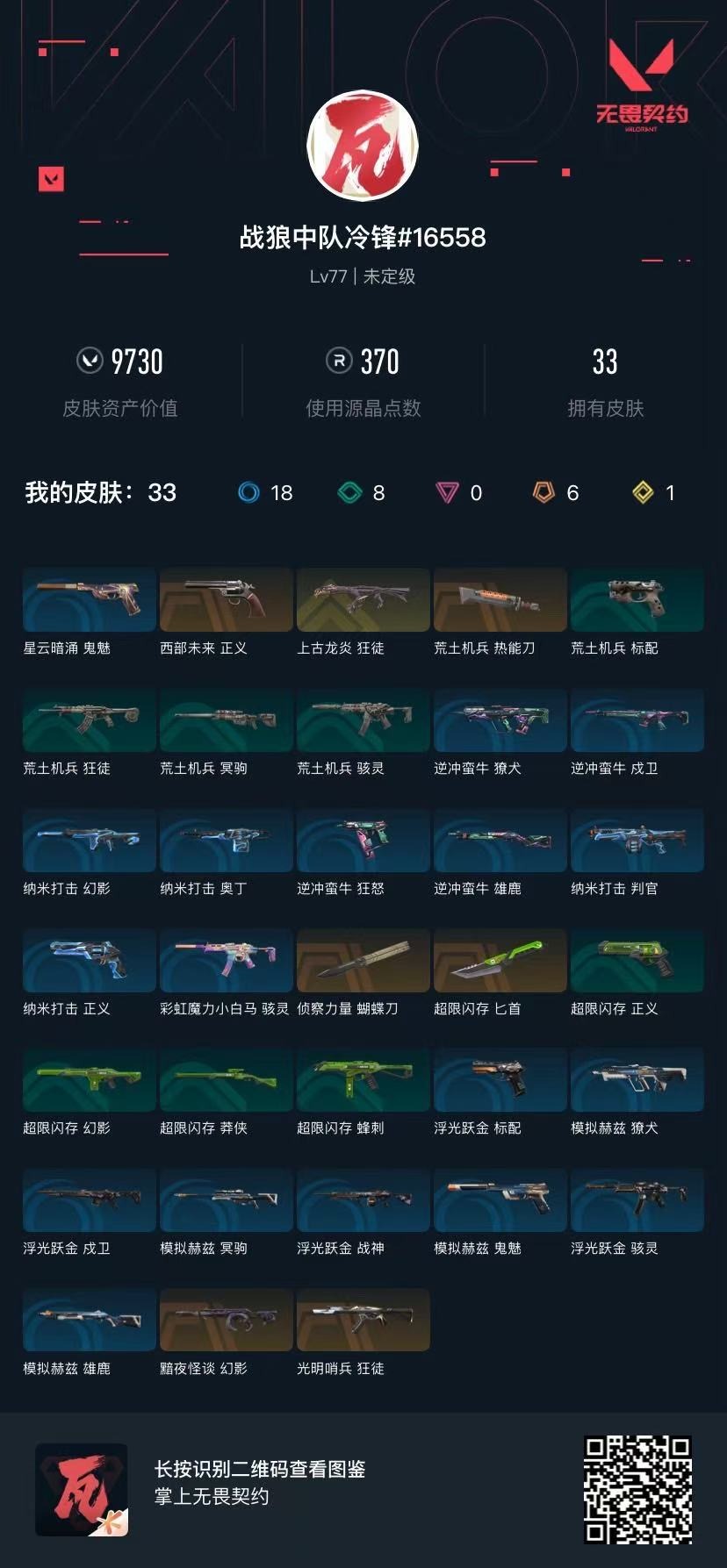 [12260699]6橙皮 1金皮 33皮肤 25英雄 50卡面 370已用源晶 未定级 优质装备:狂徒-光明哨兵,幻影-黯夜怪谈,蝴蝶刀-侦察力量,匕首-超限闪存,荒土机兵热能刀 佩枪皮肤:正义-西部未来 步枪皮肤:狂徒-上古龙炎