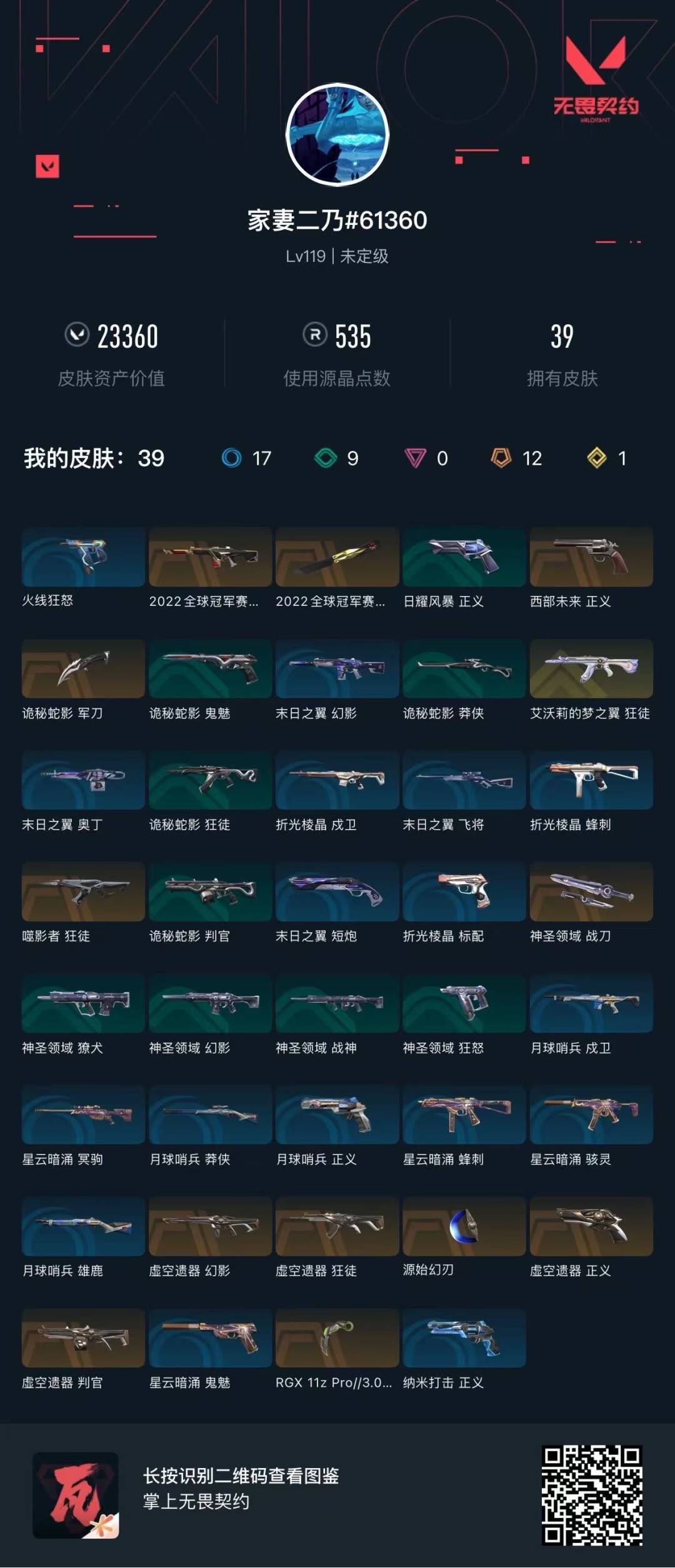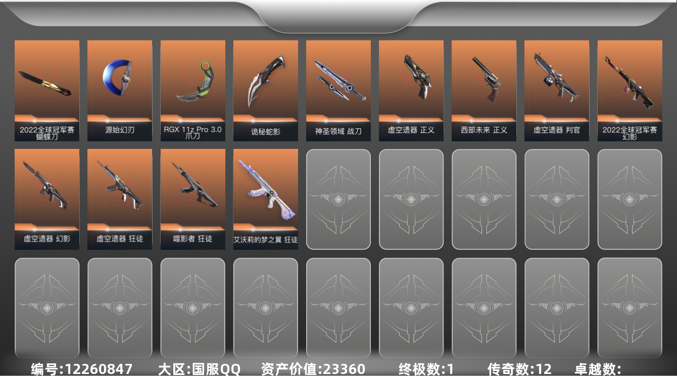 [12260847]12橙皮 1金皮 39皮肤 27英雄 64卡面 535已用源晶 未定级 优质装备:狂徒-艾沃莉的梦之翼,爪刀-RGX 11z Pro 3.0,神圣领域 战刀,源始幻刃,诡秘蛇影 亮点皮肤:幻影-2022全球冠军赛,2022全球冠军赛 蝴蝶刀 套装:2022全球冠军赛,虚空遗器 佩枪皮肤:正义-虚空遗器,正义-西部未来 霰弹枪皮肤:判官-虚空遗器 步枪皮肤:幻影-虚空遗器,狂徒-噬影者,狂徒-虚空遗器