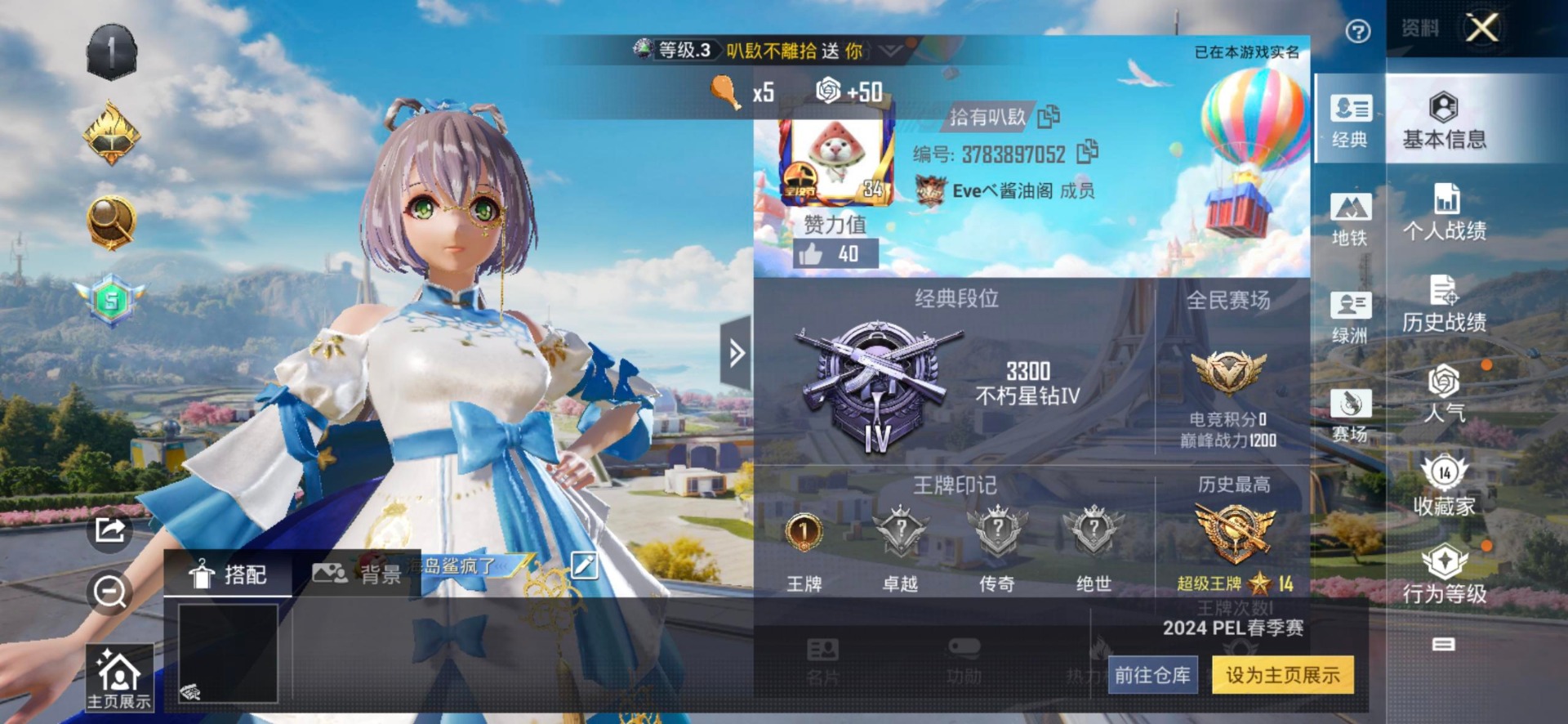 - PX_2093861-贵族等级: V4 英雄数: 53 皮肤数: 17 传说皮: 澜逐花归海 限定皮: 逐霄战戟
