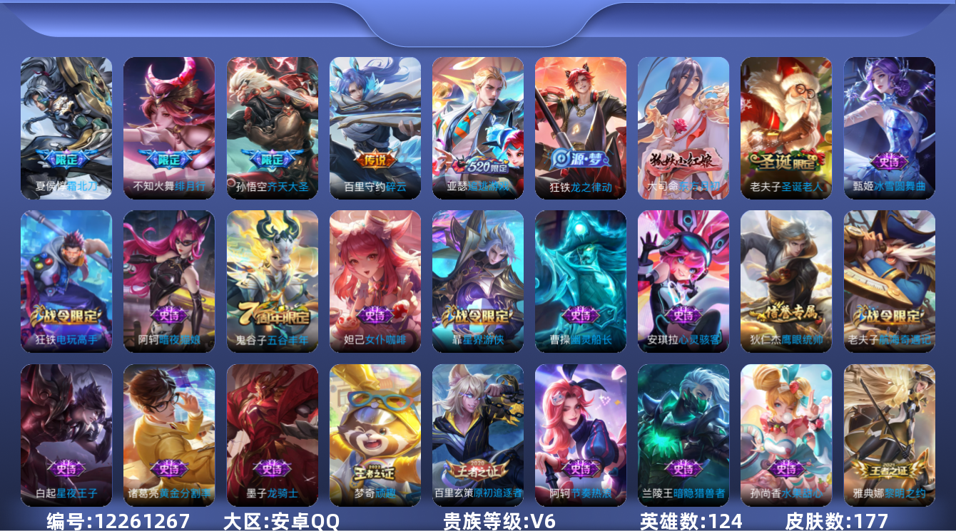 [12261267]V6 124英雄 177皮肤 可修改实名 白起小国标 扁鹊大国标 钟无艳大国标 赵怀真小国标 亚瑟小国标 安琪拉小国标 营地封十年 信用分50 优质装备:碎云,追逃游戏(亚瑟) 珍宝阁皮:优雅恋人 限定皮:夏侯惇霜北刀,绯月行,高山流水,齐天大圣,降魔,五谷丰年,圣诞老人 史诗皮:龙之律动,东方月初,蒙犽顽岩魄,黄金分割率,闲日渔趣,蒙恬荣光圣徽,暗夜猫娘,龙骑士(小龙虾),乱世虎臣,节奏热浪,女仆咖啡,摇滚巨星,水果甜心,星夜王子,心灵骇客,暗隐猎兽者,幽灵船长,鬼剑武藏,乐园奇幻夜,地狱岩魂,逐浪之夏,金属风暴,原初追逐者,圣诞狂欢,鹰眼统帅,魅力维加斯,黎明之约,滕王阁序