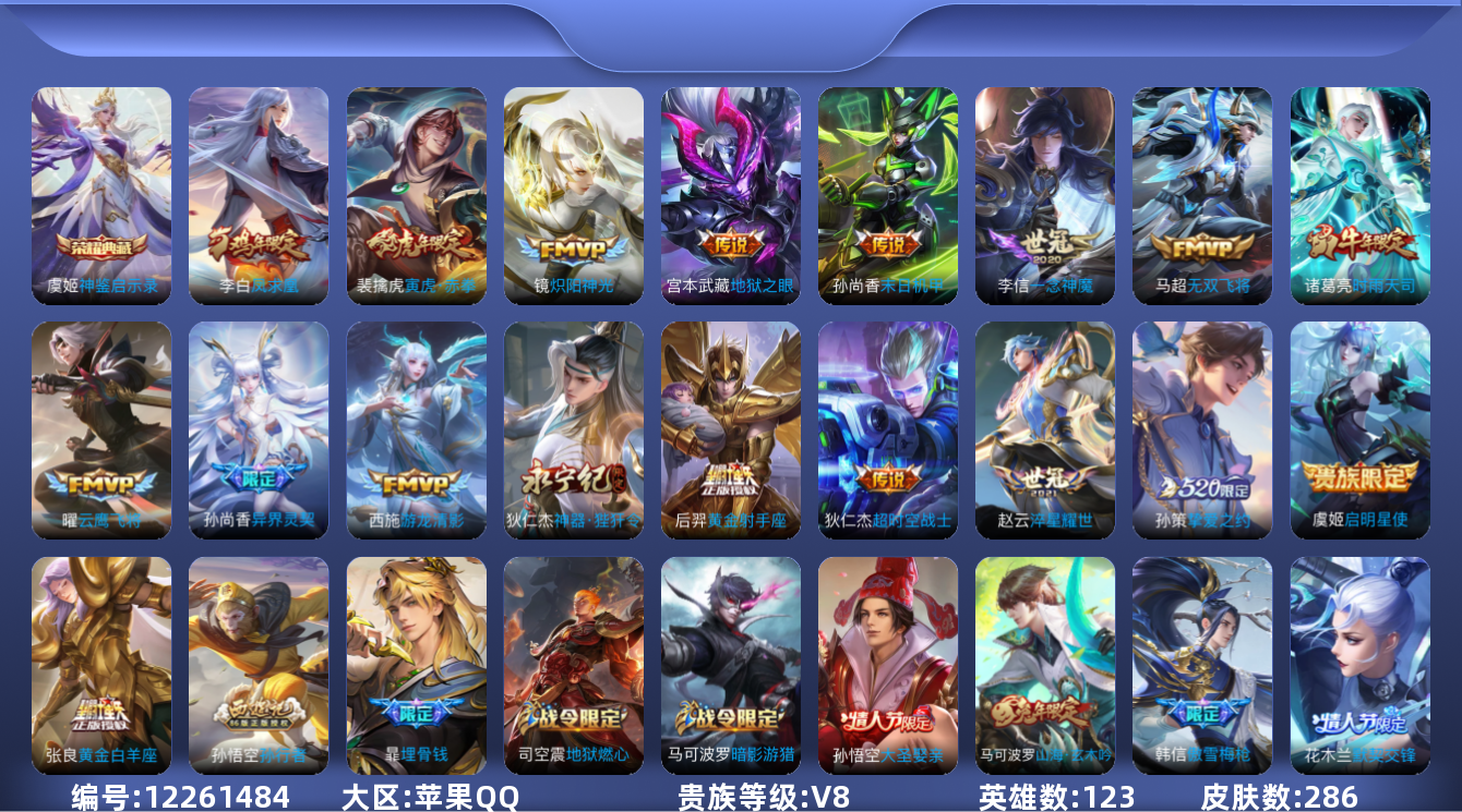 [12261484]V8 1典藏 18传说 123英雄 286皮肤 可修改实名 女号 优质装备:神鉴启示录,黄金射手座,云鹰飞将(小将军),黄金白羊座,炽阳神光,一念神魔,末日机甲-孙尚香(绿蚂蚱),地狱之眼,游龙清影(小青龙),淬星耀世,超时空战士-狄仁杰,挚爱之约,无双飞将,神器·狴犴令 珍宝阁皮:妄想食味,蔷薇恋人 限定皮:凤求凰(白切鸡),异界灵契(白毛香),傲雪梅枪,时雨天司(水龙头),遇见飞天,高山流水,五谷丰年,梁祝,天狼溯光者,天狼征服者,李小龙,霸王别姬-虞姬,默契交锋-花木兰,孙行者,一生所爱,大圣娶亲,寅虎·赤拳(老虎年限),神器·万象笔,山海·玄木吟(马可年限) 史诗皮:破空之剑,战舞者,蒙犽顽岩魄,埋骨钱,紫霞仙子,苍穹之光,黄金分割率,特工魅影,千年之狐,永昼,江河有灵,魅语,无限星赏官,冰冠公主,偶像歌手,晚萤,电玩·爆裂旋风,暗夜猫娘,龙骑士(小龙虾),末日机甲-吕布,猫狗日记-孙策,猫狗日记-大乔,乱世虎臣,节奏热浪,修罗,女仆咖啡,摇滚巨星,水果甜心,绅士熊喵,星夜王子,心灵骇客,功夫厨神,德古拉伯爵,暗隐猎兽者,鬼剑武藏,心灵战警,舞动绿茵,地狱岩魂,诗语江南,纤云弄巧,繁星吟游(呼啦呼啦),拒霜思,缤纷独角兽,乘风破浪,逐浪之夏,水晶猎龙者,曙光守护者,唤灵魅影,原初追逐者,圣诞狂欢,圣诞恋歌,鹰眼统帅,魅力维加斯,黎明之约,赏金猎手,奇遇舞章,天秀·音浪,无心,未来纪元-赵云