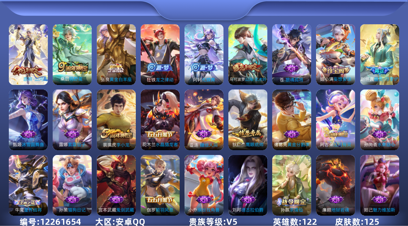[12261654]V5 3传说 122英雄 125皮肤 可修改实名 优质装备:黄金白羊座 珍宝阁皮:妄想食味 限定皮:愿照·山河定(司空震年限),逐霄战戟,鸣野蒿,李小龙,山海·玄木吟(马可年限) 史诗皮:器灵·浮梦炉,糖绘人间,狼魂孤将,化蝶舞,星界战将,龙之律动,茶境仙,蒙犽顽岩魄,紫霞仙子,黄金分割率,江河有灵,猫狗日记-孙策,摇滚巨星,水果甜心,天才门将,德古拉伯爵,鬼剑武藏,地狱岩魂,缤纷独角兽,水晶猎龙者,箭羽风息,鹰眼统帅,魅力维加斯