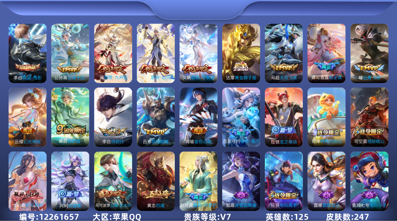 [12261657]V7 1典藏 13传说 125英雄 247皮肤 可修改实名 优质装备:鸣剑·曳影,黄金狮子座,云鹰飞将(小将军),音你心动-周瑜,无双飞将 传说皮:云诺千山,幻光神枪 珍宝阁皮:胡桃夹子,玩趣恶龙 限定皮:愿照·九州拓(澜年限),愿照·山河定(司空震年限),愿照·千秋盛(女娲年限),逐霄战戟,陌上桑,鸣野蒿,前尘镜,瑞麟志(木兰年限),高山流水,诗剑行,怒海麟威,五谷丰年,烈魂,山海·玄木吟(马可年限) 史诗皮:鸭鸭历险记-刘禅,器灵·浮梦炉,化蝶舞,星界战将,龙之律动,雪豹·霜爪,茶境仙,东方月初,蒙犽顽岩魄,芈月浮光幕影,紫霞仙子,苍穹之光,电玩小子(小书包),黄金分割率,特工魅影,千年之狐,永昼,江河有灵,百解令(蒙犽),蒙恬荣光圣徽,无限星赏官,末日机甲-吕布,猫狗日记-孙策,猫狗日记-大乔,乱世虎臣,节奏热浪,女仆咖啡,水果甜心,绅士熊喵,天才门将,星夜王子,功夫厨神,德古拉伯爵,暗隐猎兽者,幽灵船长,鬼剑武藏,心灵战警,乐园奇幻夜,舞动绿茵,地狱岩魂,拒霜思,缤纷独角兽,乘风破浪,逐浪之夏,月团寄思,水晶猎龙者,曙光守护者,箭羽风息,唤灵魅影,金属风暴,圣诞狂欢,圣诞恋歌,鹰眼统帅,暗夜贵公子,魅力维加斯,赏金猎手,无心,未来纪元-赵云