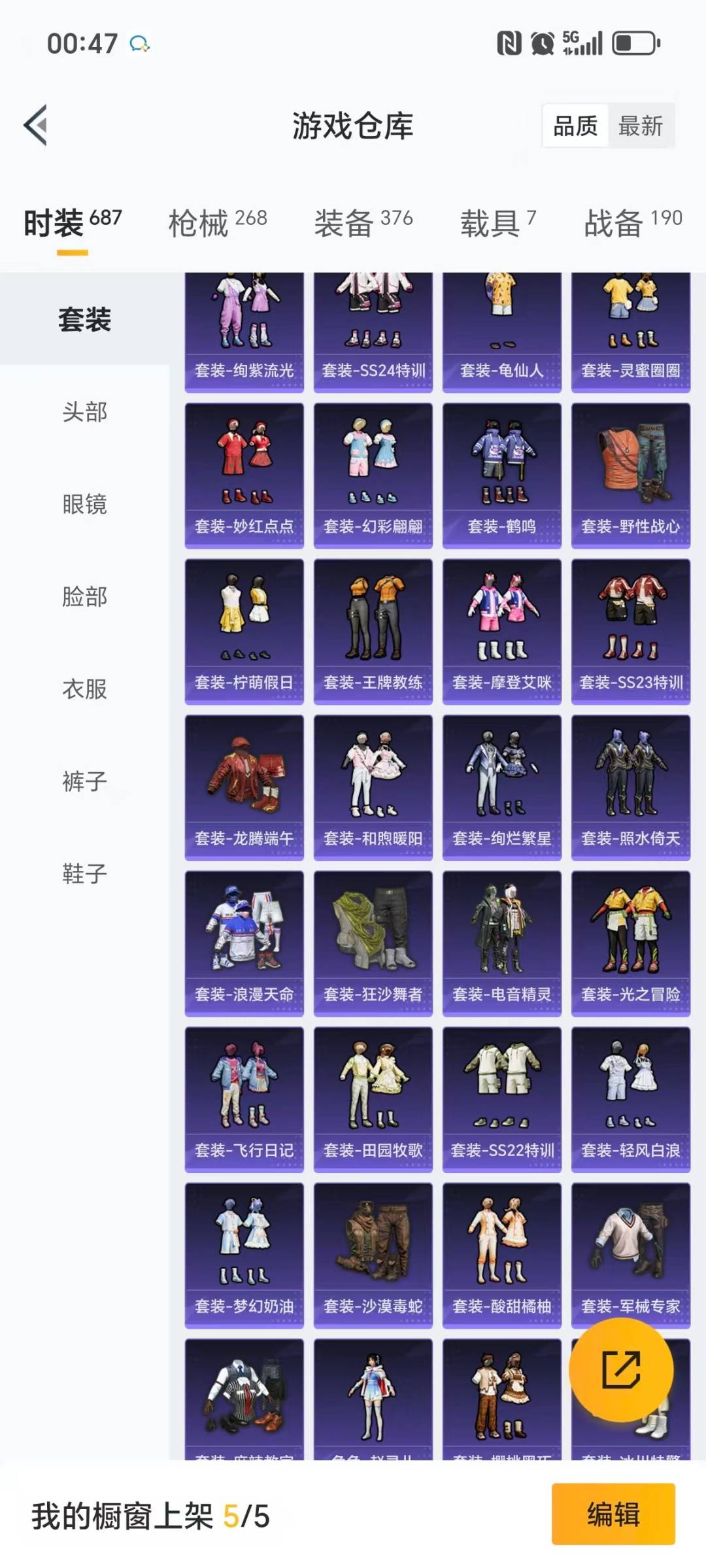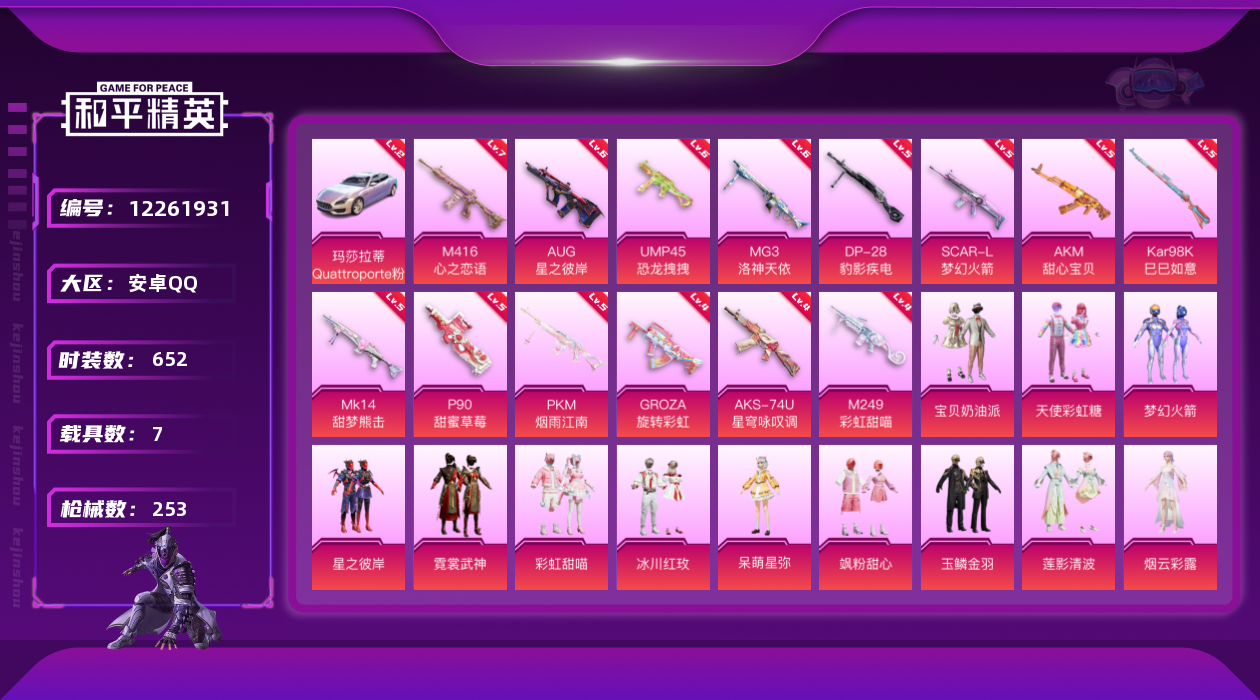 [12261931]14粉装 14特效枪 7载具 18印记 可二次 可修改实名 身法装备:暗影哥特(红眼罩) 优质装备:玛莎拉蒂Quattroporte(幻星粉),二级玛莎拉蒂Quattroporte(幻星粉),合金龙骨(蓝),海龙奔腾,玛莎拉蒂Grecale(薄荷绿),玛莎拉蒂MC20(星石白),玛莎拉蒂Quattroporte(夜幕蓝),MG3洛神天依,SCAR-L梦幻火箭,AKM甜心宝贝,M416心之恋语,梦幻火箭(新101)(新火箭少女101粉色套装),宝贝奶油派,天使彩虹糖,星之彼岸,AUG星之彼岸,UMP45恐龙拽拽,M249彩虹甜喵(M249-彩虹甜喵),P90甜蜜草莓(P90-甜蜜草莓),GROZA旋转彩虹,PKM江南烟雨,七级M416-心之恋语,AKS-74U-星穹咏叹调,MK14-甜梦熊击,幻彩电音,Kar98K-巳巳如意 热门装扮:霓裳武神,彩虹甜喵,冰川红玫,冰川幽秘,飒粉甜心,呆萌星弥,玉鳞金羽,莲影清波,烟云彩露 载具:双人摩托-梦幻火箭 稀有枪皮:DP-28-豹影疾电 六级特效枪:六级AUG-星之彼岸,六级UMP45-恐龙拽拽,六级MG3-洛神天依 五级特效枪:五级Kar98K-巳巳如意,五级SCAR-L-梦幻火箭,五级AKM-甜心宝贝,五级DP-28-豹影疾电,五级MK14-甜梦熊击,五级PKM-江南烟雨,五级P90-甜蜜草莓 四级特效枪:四级AKS-74U-星穹咏叹调,四级GROZA-旋转彩虹,四级M249-彩虹甜喵 紫色装扮:SS30特训套装,SS31特训套装,SS33特训套装,旭日情侣,SS23特训,田园牧歌,绚烂繁星,照水倚天,轻风白浪,幻彩翩翩,和煦暖阳,SS22特训,摩登艾咪,妙红点点,灵蜜圈圈,夏日音浪,幻世战舞者,六六大吉,军械专家,冰川特警,娇憨猪猪,电音精灵,天籁歌者,瑞龙福将,团圆交子,醒狮腾龙,SS17特训,炫光向阳,萌趣颜团子,SS21特训,SS20特训,梦幻奶油,酸甜橘柚,樱桃黑巧,俏皮奶喵,暖心橘喵,灵幻魔术师,灵动马戏师,夏雨游龙,萌趣咩咩,异彩先驱,SS18特训,风铃甜诗,飞驰魅影,音速流光,极速竞梦,SS19特训,龙的传人,飞行日记,骑行爱好者,魅力单车,鹤鸣,麻辣教官,黄色名流,黄色运动,黎明保卫者,黑色伏地魔,龙腾端午,龟仙人,冰河战士,龙魂突击队,蝶变,香桃花海,酷潮明星,野性战心,长空猛禽,霓虹极客,霓虹街