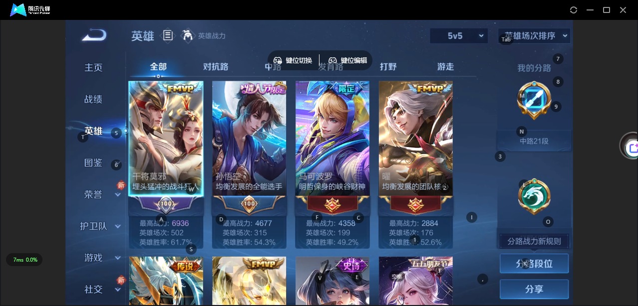 - [11523454]V7 3传说 120英雄 113皮肤 可修改实名 珍宝阁皮:蔷薇恋人 限定皮:鸣野蒿,夏侯惇霜北刀,怒海麟威,五谷丰年,孙行者,神器·万象笔,山海·玄木吟(马可年限) 史诗皮:蒙犽顽岩魄,匿光侦查者,百解令(蒙犽),偶像歌手,节奏热浪,水果甜心,天才门将,德古拉伯爵,舞动绿茵,地狱岩魂,拒霜思,缤纷独角兽,逐浪之夏,金属风暴,圣诞恋歌,鹰眼统帅,赏金猎手,无心