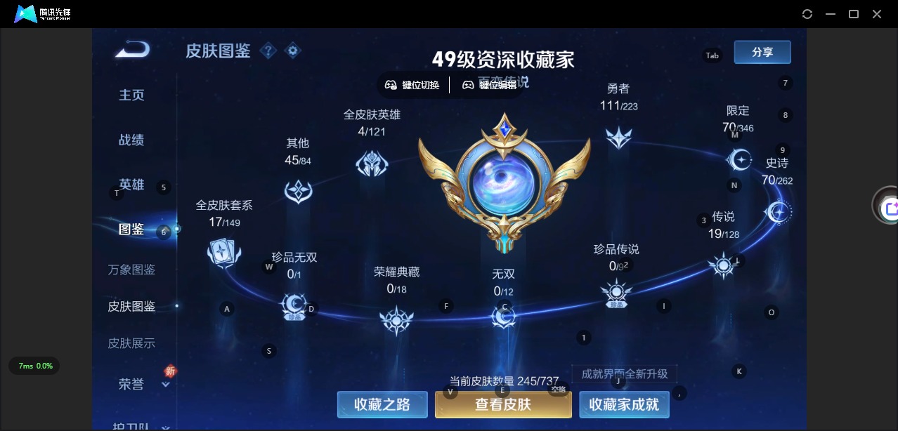 - PX_2112150-贵族等级: V4 英雄数: 122 皮肤数: 109 传说皮: 澜逐花归海,幻光神枪 限定皮: 李小龙,鸣野蒿,愿照·九州拓