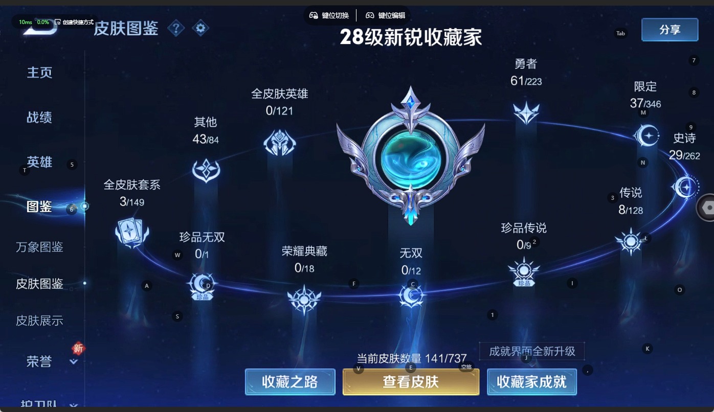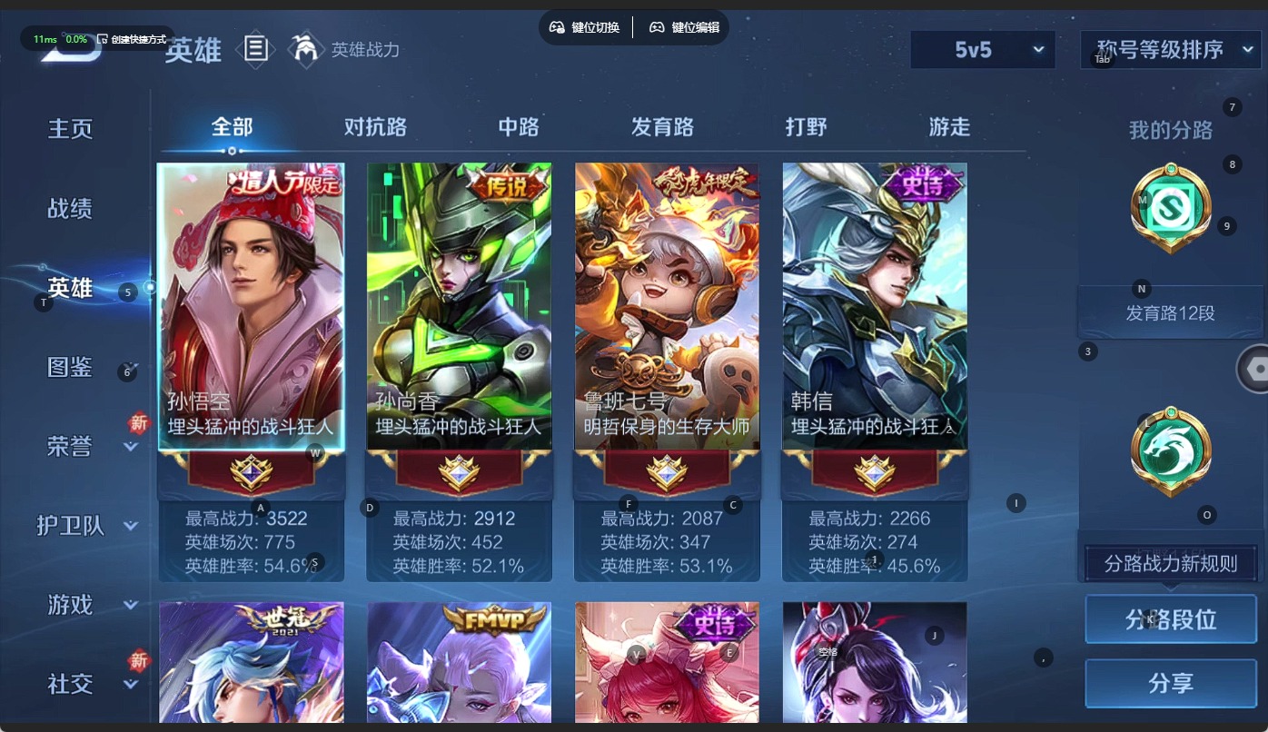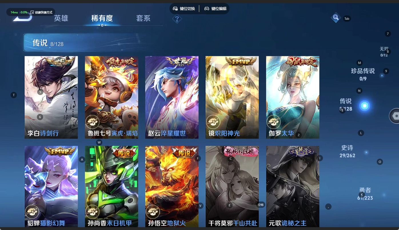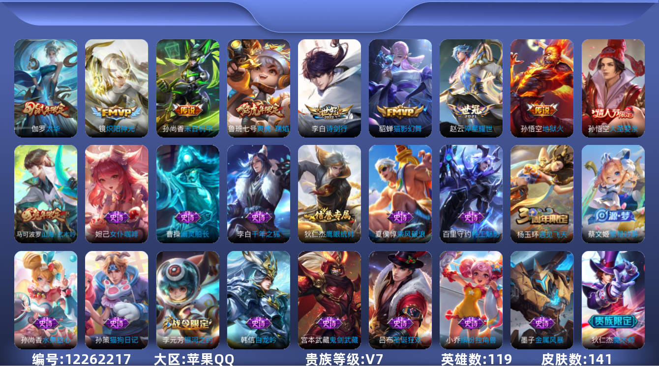 - [11688972]V7 2典藏 3珍品传说 8传说 125英雄 341皮肤 可修改实名 优质装备:鸣剑·曳影,弑枪猎影(韩信典藏),怪盗基德,一念神魔,胖达荣荣,涂山容容 珍品传说:时之奇旅-孙策,兔狲·蓬尾 传说皮:落雪白狼,死亡执政官,幻光神枪 珍宝阁皮:妄想食味,蔷薇恋人 限定皮:愿照·岁时盈(虞姬年限),逐霄战戟,鸣野蒿,白鹤梁神女,遇见飞天,五谷丰年,梁祝,李小龙,永曜之星,圣诞老人,孙行者,百木心枪,玉兔公主,天降福星 史诗皮:鸭鸭历险记-刘禅,器灵·浮梦炉,化蝶舞,星界战将,谪仙醉月,龙之律动,雪豹·霜爪,石田雨龙,百相守梦-周瑜,茶境仙,破空之剑,战舞者,东方月初,蒙犽顽岩魄,琥珀纪元伽罗,蔬乡物语(鲁班七号),百相守梦-百里守约,百相守梦-黄忠,织梦人,紫霞仙子,特工魅影,江河有灵,雪夜绮愿(周瑜),魅语,百解令(蒙犽),高渐离燃音魔法,蒙恬荣光圣徽,偶像歌手,白蛇,电玩·爆裂旋风,末日机甲-吕布,猫狗日记-孙策,乱世虎臣,节奏热浪,女仆咖啡,摇滚巨星,水果甜心,天才门将,星夜王子,心灵骇客,功夫厨神,德古拉伯爵,暗隐猎兽者,幽灵船长,鬼剑武藏,心灵战警,乐园奇幻夜,舞动绿茵,地狱岩魂,纤云弄巧,拒霜思,缤纷独角兽,乘风破浪,逐浪之夏,水晶猎龙者,曙光守护者,金属风暴,原初追逐者,圣诞狂欢,圣诞恋歌,鹰眼统帅,王者之锤,魅力维加斯,未来纪元-赵云
