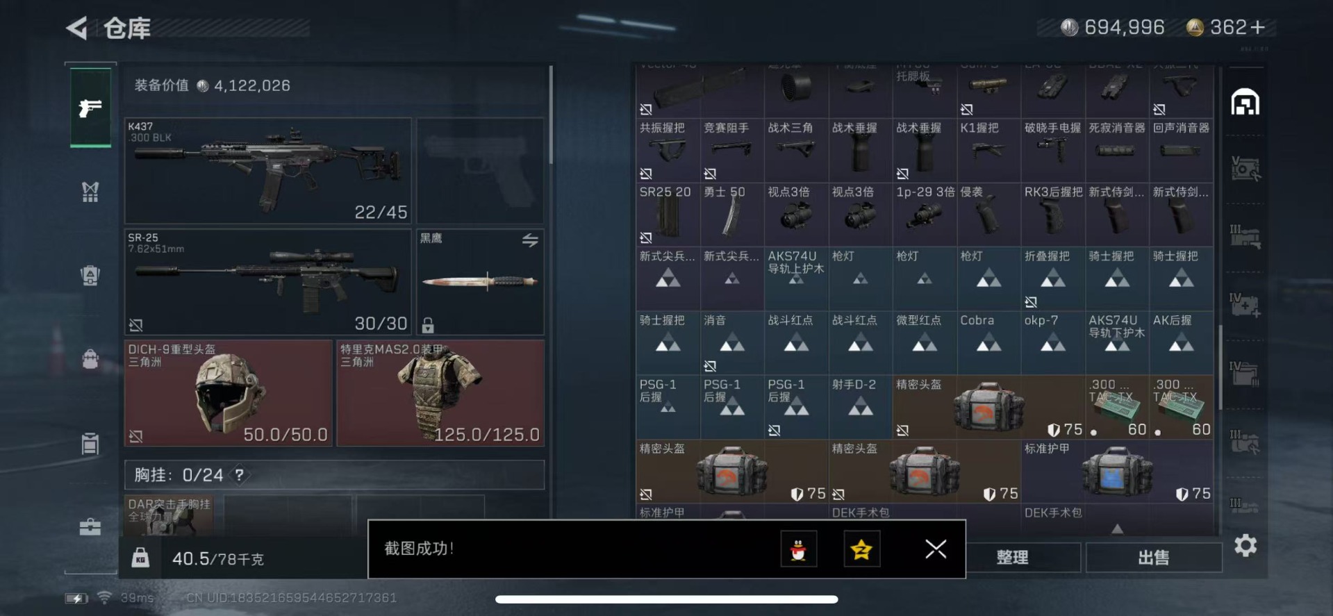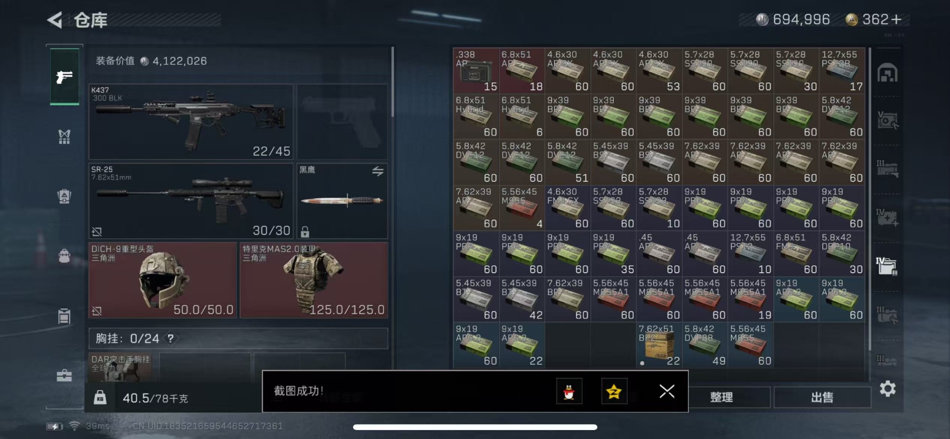 - [11527137]总资产:349.6M 1干员外观 8传说枪械 哈夫币:61.104K 可二次 可修改实名 优质装备:顶级安全箱(3x3) 烽火地带段位:黄金 全面战场段位:军士长 传说武器皮肤:AK-12突击步枪-夜鹰,SMG45冲锋枪-骑士,93R-捞点薯条,AWM狙击步枪-捞点薯条,腾龙突击步枪-捞点薯条,CAR-15突击步枪-阿米娅,复合弓-黑-天际线,M4A1突击步枪-阿米娅 史诗武器皮肤:AUG突击步枪-蝮蛇,Ash-12战斗步枪-守夜人,AS Val突击步枪-尖端治疗,SG552突击步枪-尖端治疗,PKM通用机枪-荒野求生,SG552突击步枪-深海恐惧,AKM突击步枪-林中猎手,SR-3M紧凑突击步枪-荒野求生,M1014霰弹枪-林中猎手,PTR-32突击步枪-英雄,SVD狙击步枪-荒野求生,M250通用机枪-囚徒,腾龙突击步枪-无垢,MP7冲锋枪-无垢,PSG-1射手步枪-无垢,QBZ95-1突击步枪-曙光,沙漠之鹰-曙光,S12K霰弹枪-曙光,PKM通用机枪-英雄 干员外观:蜂医-送葬人·无题密令(S5)