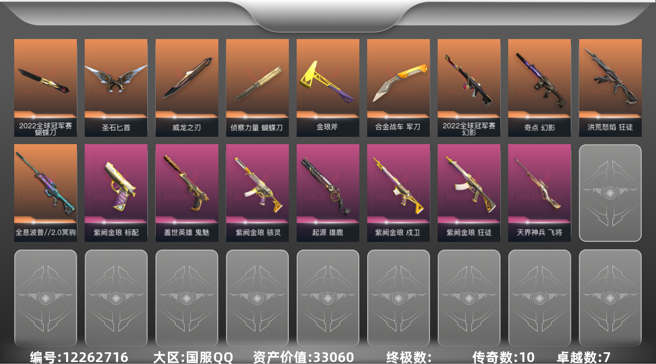 [12262716]10橙皮 7紫皮 47皮肤 25英雄 91卡面 690已用源晶 铂金 优质装备:紫阙金琅套装,幻影-奇点,狂徒-紫阙金琅,狂徒-洪荒怒焰,冥驹-全息波普//2.0,标配-紫阙金琅,军刀-合金战车,金琅斧,蝴蝶刀-侦察力量,飞将-天界神兵,鬼魅-盖世英雄,圣石匕首,威龙之刃,雄鹿-起源,骇灵-紫阙金琅,戍卫-紫阙金琅 亮点皮肤:幻影-2022全球冠军赛,2022全球冠军赛 蝴蝶刀 套装:2022全球冠军赛
