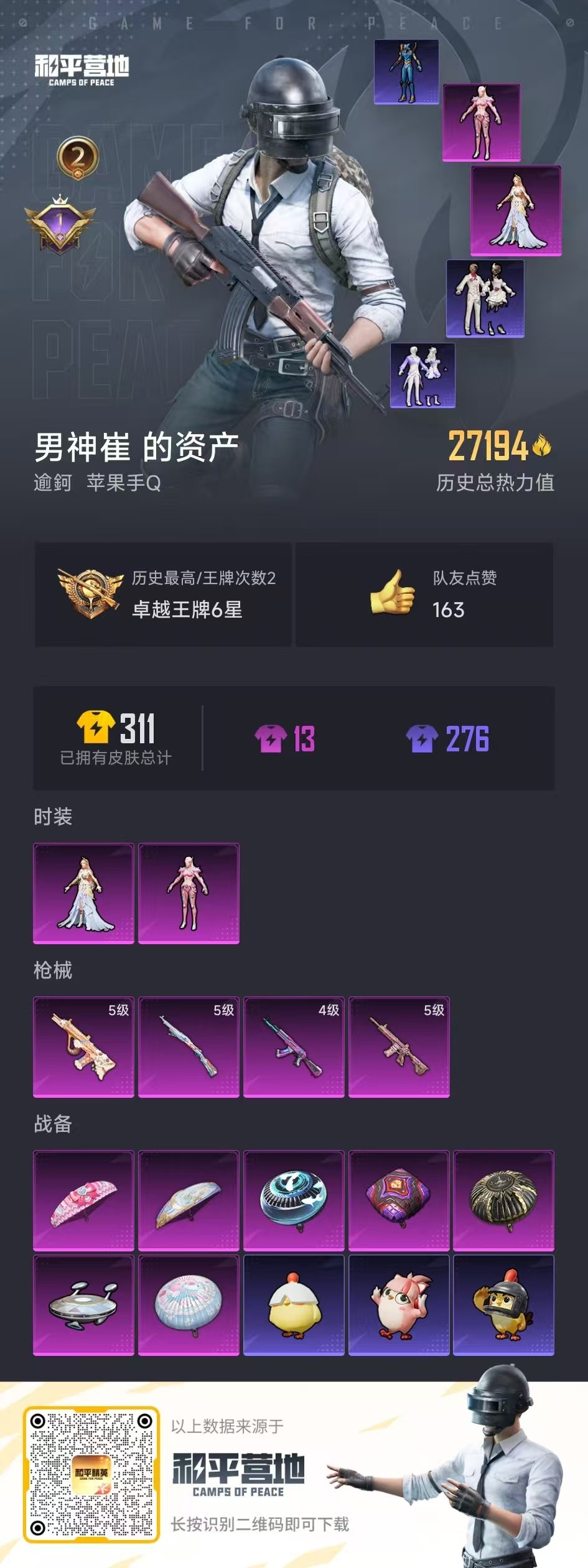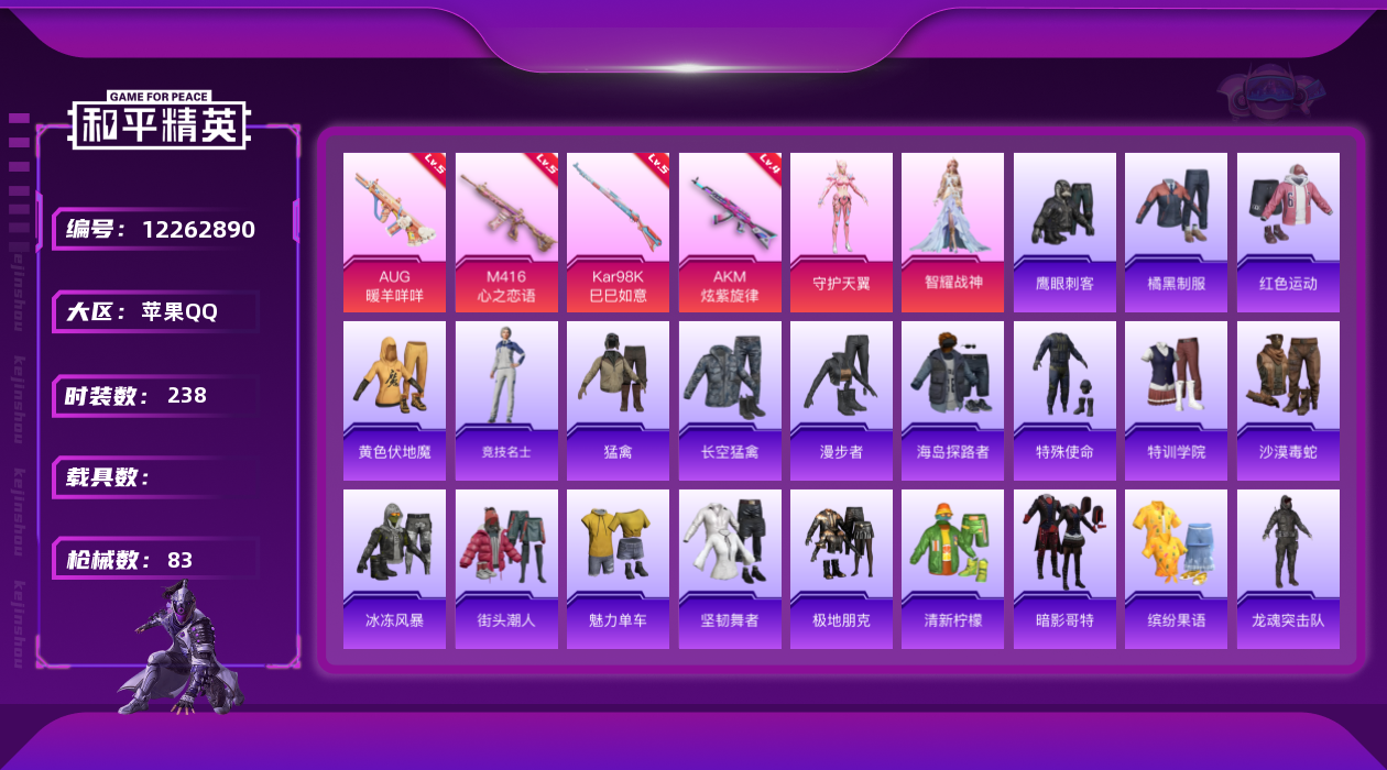 [12262890]2粉装 4特效枪 2印记 可二次 可修改实名 身法装备:暗影哥特(红眼罩),Mark.06(新蓝螳螂) 优质装备:AKM炫紫旋律,M416心之恋语,AUG-暖羊咩咩,智耀战神,Kar98K-巳巳如意 热门装扮:守护天翼,鹰眼刺客 五级特效枪:五级M416-心之恋语,五级Kar98K-巳巳如意,五级AUG-暖羊咩咩 四级特效枪:四级AKM-炫紫旋律 紫色装扮:幻彩翩翩,SS23特训,妙红点点,SS30特训套装,SS31特训套装,SS33特训套装,SS21特训,田园牧歌,轻风白浪,SS22特训,香榭午后,坚韧舞者,冰川特警,萌趣咩咩,军械专家,娇憨猪猪,天籁歌者,风暴特警,飞行日记,魅力单车,麻辣教官,黄色伏地魔,冰河战士,龙魂突击队,蝶变,长空猛禽,街头潮人,清新柠檬,牛气冲天,牛气满满,海岛探路者,极地朋克,橘黑制服,沙漠毒蛇,红色运动,缤纷果语,特殊使命,特训学院,猛禽,粉日山川,Mark.06(新蓝螳螂),鱼渊荷华,玉兔迎春,燕燕于飞,巳巳如意,竞技名士,暗影哥特(红眼罩),银尘,惊鸿侠骨,SS24特训(SS24特训套装),SS25特训,锦衣飞扬,萌趣绒叽,星渊小夜曲,SS32特训服(SS32特训套装),蓝冰羽,绯格组合,紫幽梦,白糯汤圆,光之冒险,漫步者,冰冻风暴 优质战备:初号机 觉醒Ver.降落伞,月影灵韵降落伞,脆鲨七海降落伞,樱桃泡泡降落伞,千面幻镜飞行器,彩虹甜喵降落伞,暗夜鎏金降落伞