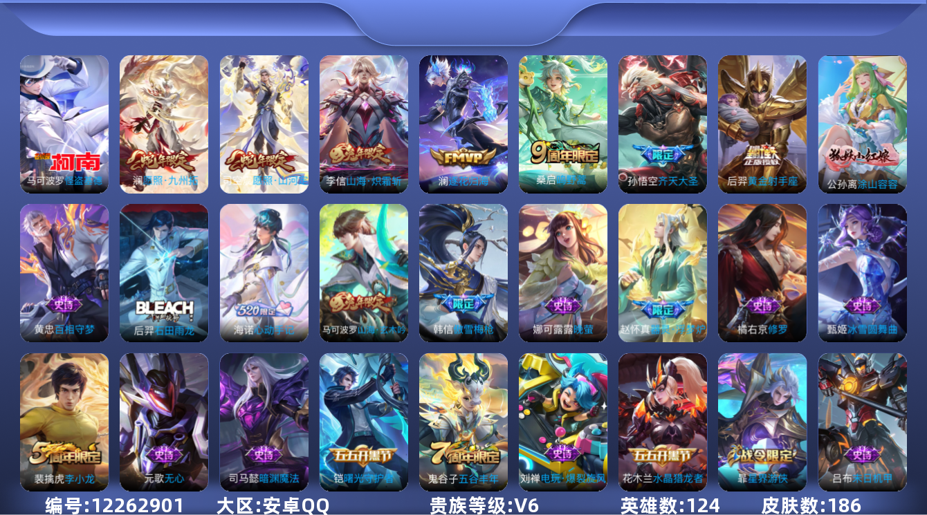 [12262901]V6 1珍品传说 7传说 124英雄 186皮肤 可修改实名 优质装备:怪盗基德,黄金射手座,山海·炽霜斩(李信年限),澜逐花归海,涂山容容 珍宝阁皮:胡桃夹子,蔷薇恋人 限定皮:愿照·九州拓(澜年限),愿照·山河定(司空震年限),鸣野蒿,傲雪梅枪,齐天大圣,五谷丰年,李小龙,山海·玄木吟(马可年限) 史诗皮:器灵·浮梦炉,星界战将,石田雨龙,蒙犽顽岩魄,海诺心动手记,百相守梦-黄忠,黄金分割率,千年之狐,江河有灵,百解令(蒙犽),晚萤,电玩·爆裂旋风,末日机甲-吕布,猫狗日记-大乔,节奏热浪,修罗,摇滚巨星,水果甜心,绅士熊喵,星夜王子,心灵骇客,功夫厨神,德古拉伯爵,暗隐猎兽者,鬼剑武藏,暗渊魔法,地狱岩魂,纤云弄巧,缤纷独角兽,水晶猎龙者,曙光守护者,金属风暴,原初追逐者,圣诞狂欢,圣诞恋歌,鹰眼统帅,魅力维加斯,无心,未来纪元-赵云
