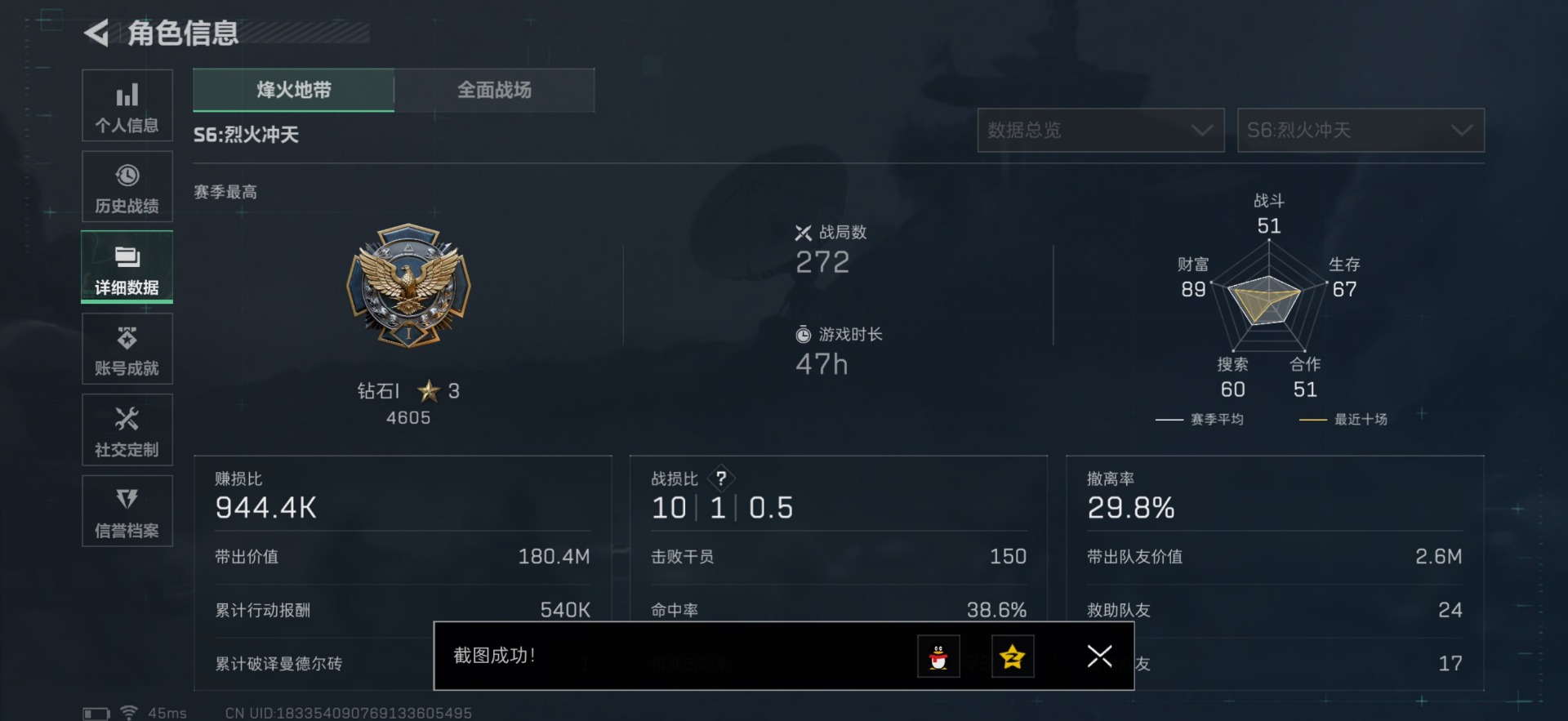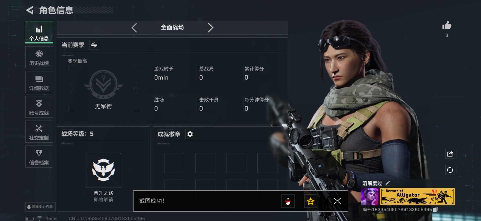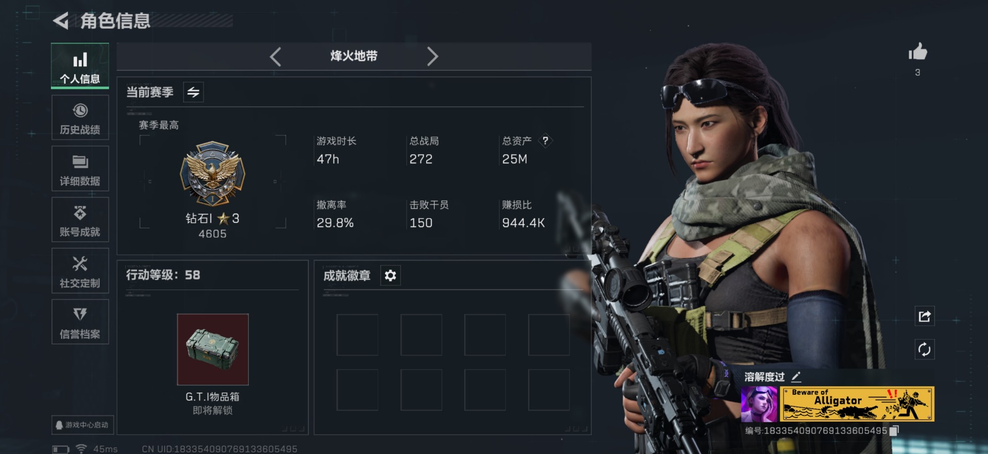 - [12088762]总资产:243.1 1干员外观 0近战传说 6传说枪械 顶级安全箱(3×3)9.15号到期 段位:无段位 可二次 可修改实名 烽火地带段位:钻石 全面战场段位:无段位 哈夫币:147 传说武器皮肤:SCAR-H战斗步枪-水墨云图,AK-12突击步枪-夜鹰,SMG45冲锋枪-骑士,复合弓-黑-天际线,CAR-15突击步枪-阿米娅,M4A1突击步枪-蚀金玫瑰 史诗武器皮肤:AUG突击步枪-蝮蛇,SR-25射手步枪-尖端治疗,AS Val突击步枪-尖端治疗,M700狙击步枪-守夜人,SG552突击步枪-尖端治疗,Ash-12战斗步枪-守夜人,MP5冲锋枪-深海恐惧,勇士冲锋枪-深海恐惧,SG552突击步枪-深海恐惧,AKM突击步枪-林中猎手,M16A4突击步枪-竞赛选手,PKM通用机枪-守夜人,M1014霰弹枪-林中猎手,SR-3M紧凑突击步枪-纷争,SV-98狙击步枪-林中猎手,PTR-32突击步枪-英雄,M250通用机枪-囚徒,SVD狙击步枪-阿萨拉工艺 干员外观:骇爪-水墨云图
