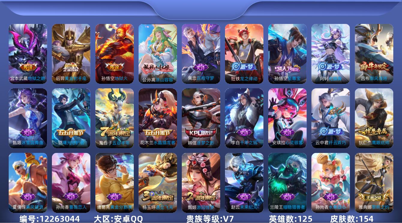 [12263044]V7 3传说 125英雄 154皮肤 可修改实名 女号 优质装备:黄金射手座,地狱火,地狱之眼,涂山容容 珍宝阁皮:蔷薇恋人 限定皮:至尊宝,遇见飞天,高山流水,五谷丰年,游园惊梦,御风骁将(吕布年限),逐梦之影 史诗皮:化蝶舞,龙之律动,百相守梦-黄忠,白龙吟,黄金分割率,千年之狐,偶像歌手,乱世虎臣,摇滚巨星,水果甜心,心灵骇客,暗隐猎兽者,鬼剑武藏,心灵战警,舞动绿茵,纤云弄巧,缤纷独角兽,乘风破浪,逐浪之夏,水晶猎龙者,曙光守护者,圣诞恋歌,鹰眼统帅,暗夜贵公子,魅力维加斯,黎明之约,未来纪元-赵云