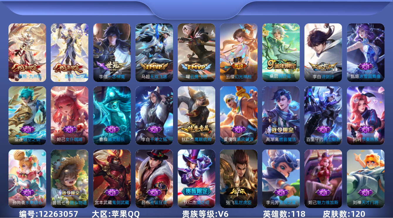 [12263057]V6 8传说 118英雄 120皮肤 可修改实名 优质装备:云鹰飞将(小将军),一念神魔,无双飞将 传说皮:幻光神枪 珍宝阁皮:女武神 限定皮:愿照·九州拓(澜年限),愿照·山河定(司空震年限),鸣野蒿,诗剑行 史诗皮:破空之剑,蔬乡物语(鲁班七号),特工魅影,千年之狐,高渐离燃音魔法,偶像歌手,乱世虎臣,节奏热浪,女仆咖啡,摇滚巨星,水果甜心,绅士熊喵,天才门将,幽灵船长,鬼剑武藏,乘风破浪,逐浪之夏,圣诞狂欢,鹰眼统帅,魅力维加斯