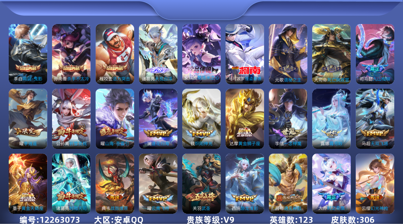 [12263073]V9 3典藏 1无双 2珍品传说 35传说 123英雄 306皮肤 可修改实名 优质装备:活力突击,杀手不太冷,鸣剑·曳影,天机白泽,怪盗基德,酷洛米之心,黄金狮子座,冠军飞将,云鹰飞将(小将军),炽阳神光,一念神魔,地狱火,仲夏夜之梦(大飞蛾),李逍遥,乞巧织情,时之恋人-刘备(电焊工),游龙清影(小青龙),挚爱之约,无双飞将,音你闪耀(rap皮),山海·苍雷引(电光曜子),灼幽烈阳,惊梅引,遇见神鼓,大乔-时之奇旅,霜月吟,澜逐花归海,黄金天蝎座,诡秘之主,涂山容容 传说皮:典韦战鼓燎原,死亡执政官,九山相柳,幻光神枪 珍宝阁皮:妄想食味,胡桃夹子,女武神 限定皮:逐霄战戟,鸣野蒿,至尊宝,傲雪梅枪,白晶晶,时雨天司(水龙头),影龙天霄,高山流水,诗剑行,五谷丰年,武圣,梁祝,祈雪灵祝(雪兔子),李小龙,霸王别姬-虞姬,匿光追影者,寅虎·御盾(廉颇年限),寅虎·心曲(虎婆),启示之音,山海·玄木吟(马可年限) 史诗皮:鸭鸭历险记-刘禅,星界战将,谪仙醉月,龙之律动,藏狐·褐绒,布丁狗之誓,百相守梦-周瑜,怒海争锋,东方月初,蒙犽顽岩魄,蔬乡物语(鲁班七号),百相守梦-百里守约,遇见神鹿,紫霞仙子,苍穹之光,黄金分割率,千年之狐,江河有灵,匿光侦查者,鹤归松栖(赵怀真),真我赫兹(镜),魅语,高渐离燃音魔法,蒙恬荣光圣徽,无限星赏官,冰冠公主,偶像歌手,晚萤,末日机甲-吕布,时之恋人-孙尚香,乱世虎臣,节奏热浪,修罗,女仆咖啡,摇滚巨星,水果甜心,绅士熊喵,星夜王子,心灵骇客,时之奇旅-安琪拉,功夫厨神,暗隐猎兽者,幽灵船长,鬼剑武藏,暗渊魔法,心灵战警,乐园奇幻夜,天秀·启明,纤云弄巧,乘风破浪,逐浪之夏,月团寄思,水晶猎龙者,曙光守护者,热力回旋,箭羽风息,金属风暴,原初追逐者,圣诞狂欢,圣诞恋歌,鹰眼统帅,魅力维加斯,天秀·音浪,寅虎·御盾,无心,未来纪元-赵云,玫瑰异探