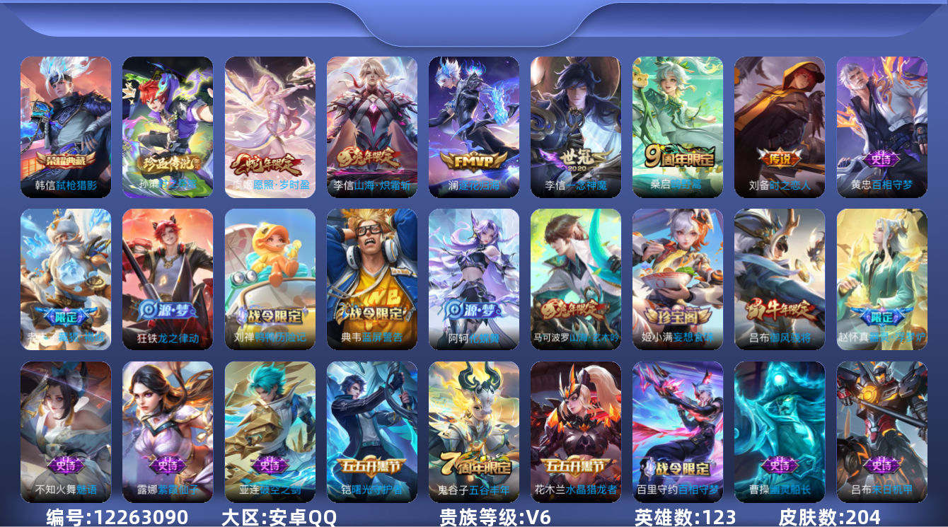 [12263090]V6 1典藏 1珍品传说 6传说 123英雄 204皮肤 可修改实名 优质装备:弑枪猎影(韩信典藏),一念神魔,时之恋人-刘备(电焊工),山海·炽霜斩(李信年限),澜逐花归海 珍品传说:时之奇旅-孙策 珍宝阁皮:妄想食味 限定皮:愿照·岁时盈(虞姬年限),逐霄战戟,鸣野蒿,五谷丰年,御风骁将(吕布年限),山海·玄木吟(马可年限) 史诗皮:鸭鸭历险记-刘禅,器灵·浮梦炉,化蝶舞,星界战将,龙之律动,藏狐·褐绒,茶境仙,破空之剑,蒙犽顽岩魄,蔬乡物语(鲁班七号),百相守梦-百里守约,百相守梦-黄忠,紫霞仙子,特工魅影,江河有灵,魅语,百解令(蒙犽),高渐离燃音魔法,偶像歌手,末日机甲-吕布,乱世虎臣,节奏热浪,水果甜心,星夜王子,暗隐猎兽者,幽灵船长,鬼剑武藏,乐园奇幻夜,舞动绿茵,纤云弄巧,乘风破浪,逐浪之夏,水晶猎龙者,曙光守护者,箭羽风息,金属风暴,原初追逐者,鹰眼统帅,魅力维加斯,未来纪元-赵云