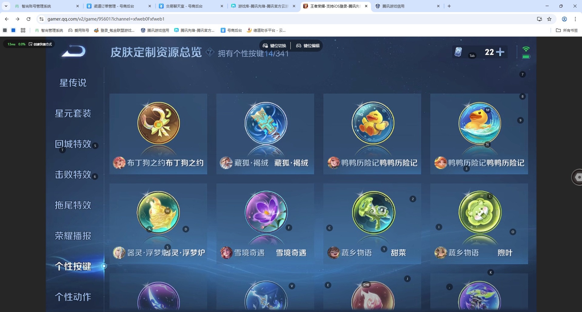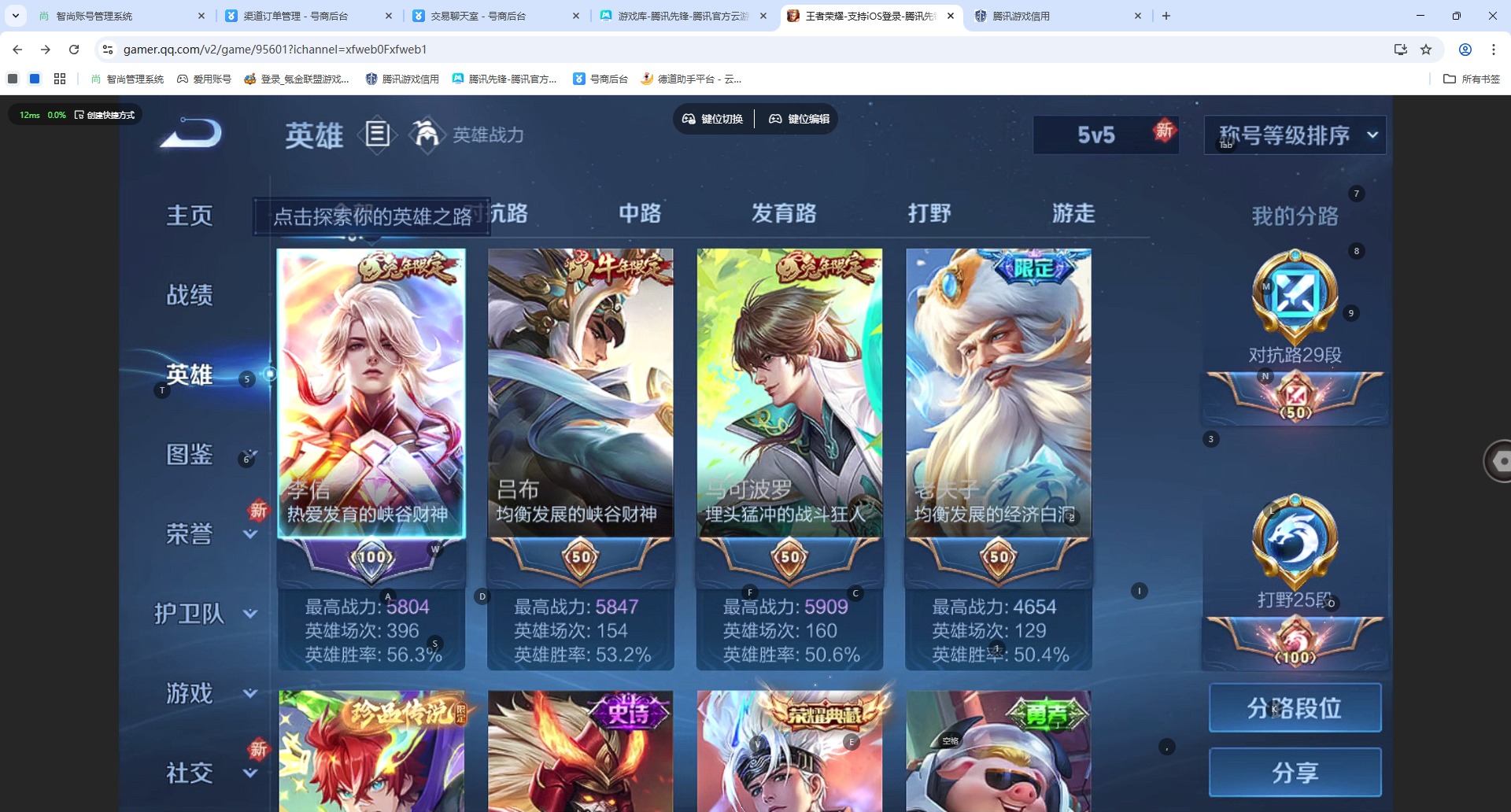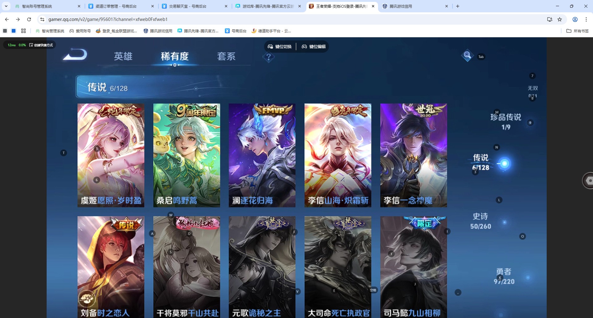- [12144593]V8 1典藏 1珍品传说 18传说 125英雄 331皮肤 可修改实名 女号 优质装备:鸣剑·曳影,怪盗基德,黄金狮子座,冠军飞将,云鹰飞将(小将军),猫影幻舞,一念神魔,末日机甲-孙尚香(绿蚂蚱),地狱火,音你心动-周瑜,超时空战士-狄仁杰 传说皮:乘龙·问璇玑(孙尚香年限),乘龙·淬吴钩(孙策年限),祥瑞亨通,幻光神枪 珍宝阁皮:妄想食味,女武神 限定皮:愿照·九州拓(澜年限),愿照·众生和(妲己年限),逐霄战戟,鸣野蒿,至尊宝,白虎志(电光耗子),傲雪梅枪,魔法小厨娘,神威(电光马子),冰锋战神,梁祝,李小龙,逐梦之影,朱雀志(守约年限),辉光之辰,冰霜恋舞曲 史诗皮:鸭鸭历险记-刘禅,苍鳞隐世,器灵·浮梦炉,化蝶舞,龙之律动,琥珀纪元伽罗,雪豹·霜爪,藏狐·褐绒,石田雨龙,茶境仙,谪仙醉月,炽弈燎原,撼地雄心,破空之剑,涂山红红,蒙犽顽岩魄,怒海争锋,紫霞仙子,苍穹之光,黄金分割率,特工魅影,千年之狐,永昼,青蛇,魅语,无限星赏官,晚萤,偶像歌手,末日机甲-吕布,猫狗日记-孙策,猫狗日记-大乔,时之恋人-孙尚香,乱世虎臣,节奏热浪,修罗,女仆咖啡,水果甜心,绅士熊喵,天才门将,星夜王子,心灵骇客,功夫厨神,德古拉伯爵,暗隐猎兽者,幽灵船长,鬼剑武藏,心灵战警,天秀·启明,舞动绿茵,地狱岩魂,诗语江南,纤云弄巧,繁星吟游(呼啦呼啦),缤纷独角兽,乘风破浪,逐浪之夏,水晶猎龙者,曙光守护者,金属风暴,原初追逐者,圣诞狂欢,圣诞恋歌,鹰眼统帅,王者之锤,暗夜贵公子,魅力维加斯,黎明之约,未来纪元-赵云,玫瑰异探
