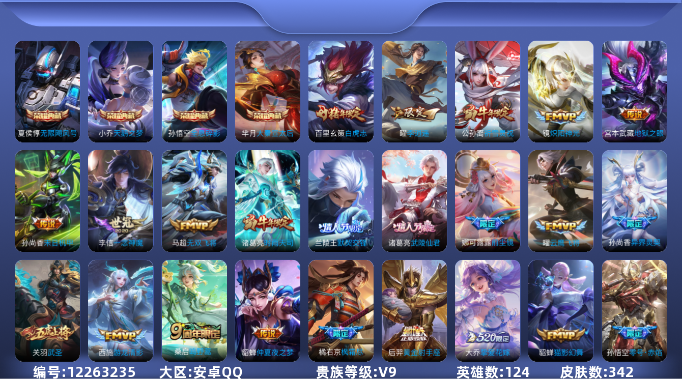 - [11880740]V7 1典藏 1无双 10传说 123英雄 238皮肤 可修改实名 优质装备:鸣剑·曳影,天机白泽,云鹰飞将(小将军),一念神魔,末日机甲-孙尚香(绿蚂蚱),地狱之眼,时之恋人-刘备(电焊工),末日机甲-孙策,碎云 珍宝阁皮:妄想食味,胡桃夹子,蔷薇恋人 限定皮:傲雪梅枪,遇见飞天,高山流水,诗剑行,齐天大圣,怒海麟威,五谷丰年,梁祝,匿光追影者,玉兔公主 史诗皮:赞萌露比,星界战将,百相守梦-黄忠,特工魅影,千年之狐,江河有灵,末日机甲-莱西奥,偶像歌手,猫狗日记-孙策,猫狗日记-大乔,时之恋人-孙尚香,节奏热浪,修罗,女仆咖啡,摇滚巨星,水果甜心,天才门将,星夜王子,功夫厨神,德古拉伯爵,暗隐猎兽者,幽灵船长,鬼剑武藏,舞动绿茵,地狱岩魂,纤云弄巧,繁星吟游(呼啦呼啦),拒霜思,缤纷独角兽,乘风破浪,水晶猎龙者,曙光守护者,热力回旋,箭羽风息,金属风暴,圣诞恋歌,鹰眼统帅,魅力维加斯,黎明之约,赏金猎手,奇遇舞章,无心,未来纪元-赵云