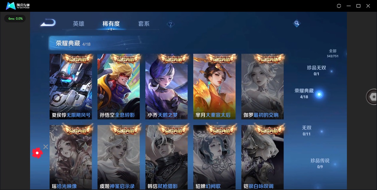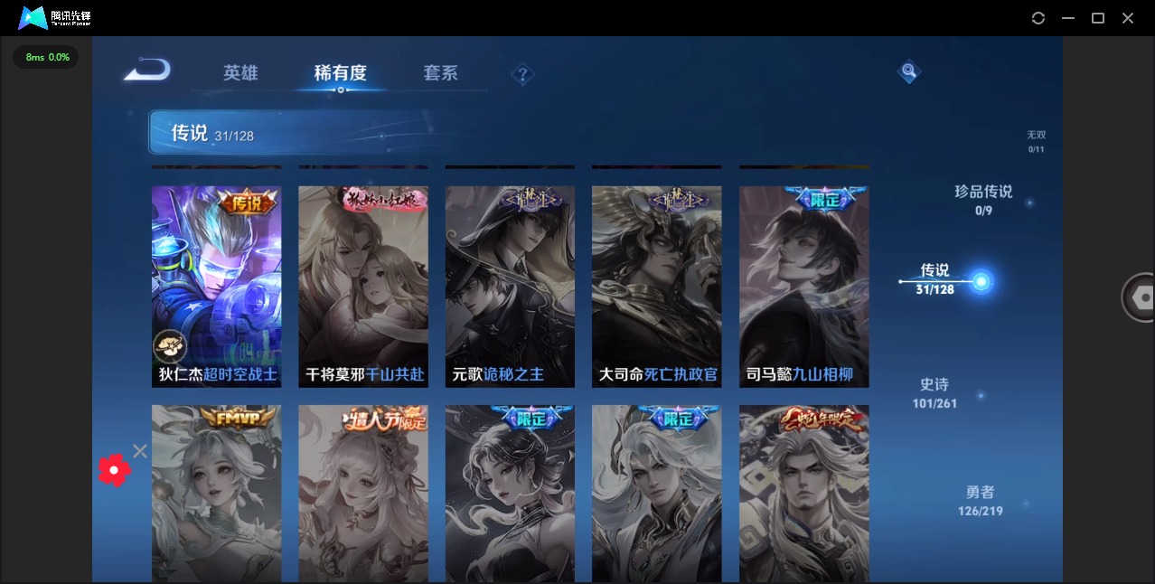 - PX_2086489-31 安卓QQ/至尊星耀/298皮肤/125英雄/1典藏/0珍品无双/0无双/0珍品传说/19传说/100史诗/9稀有英雄 【1 典藏皮肤】弑枪猎影 韩信, 【19 传说皮肤】启明星使 虞姬,电玩·雷克斯 澜,云鹰飞将 曜,齐天大圣 孙悟空,诗剑行 李白,燃星之曲 花木兰,浮生妄 夏洛特,惊梅引 宫本武藏,记忆之芯 公孙离,地狱之眼 宫本武藏,鹤羽星尊 诸葛亮,炽阳神光 镜,