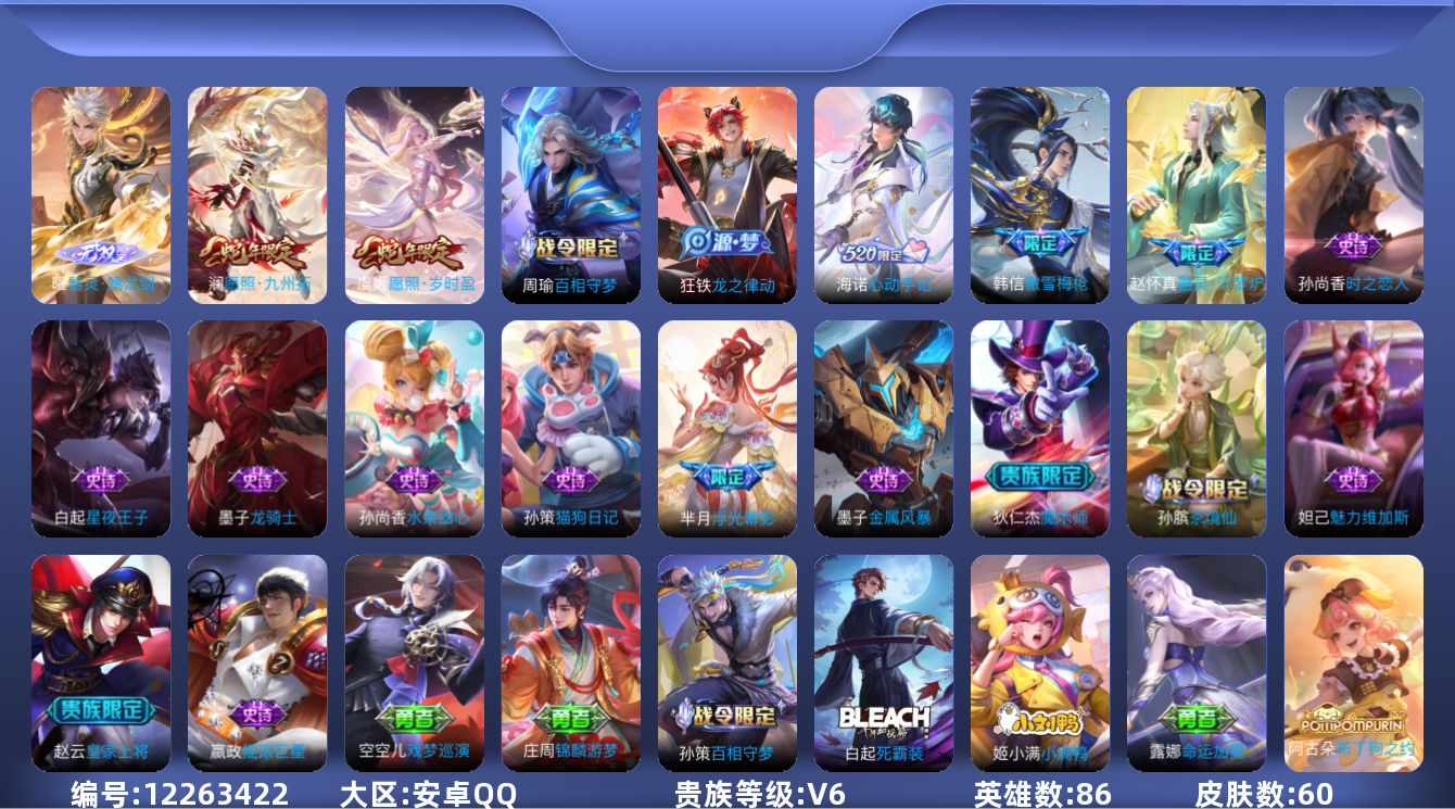 - [11884603]V8 2典藏 12传说 125英雄 326皮肤 可修改实名 优质装备:鸣剑·曳影,全息碎影(猴子典藏),黄金射手座,久胜战神,一念神魔,末日机甲-孙尚香(绿蚂蚱),李逍遥,遇见胡旋 珍宝阁皮:女武神 限定皮:愿照·九州拓(澜年限),愿照·山河定(司空震年限),鸣野蒿,异界灵契(白毛香),时雨天司(水龙头),神威(电光马子),遇见飞天,高山流水,冰锋战神,游园惊梦,梁祝,天狼狩猎者,逐梦之星,天狼溯光者,李小龙,逐梦之影,朱雀志(守约年限),霸王别姬-虞姬,孙行者,大圣娶亲,冰霜恋舞曲,美猴王 史诗皮:鸭鸭历险记-刘禅,器灵·浮梦炉,绮世丹青,瑰影绮梦,化蝶舞,龙之律动,布丁狗之誓,石田雨龙,茶境仙,埋骨钱,紫霞仙子,电玩小子(小书包),黄金分割率,千年之狐,永昼,魅语,百解令(蒙犽),无限星赏官,冰冠公主,晚萤,末日机甲-吕布,乱世虎臣,节奏热浪,修罗,女仆咖啡,水果甜心,绅士熊喵,星夜王子,心灵骇客,时之奇旅-安琪拉,功夫厨神,德古拉伯爵,暗隐猎兽者,幽灵船长,鬼剑武藏,暗渊魔法,心灵战警,乐园奇幻夜,天秀·启明,舞动绿茵,地狱岩魂,纤云弄巧,拒霜思,缤纷独角兽,乘风破浪,逐浪之夏,水晶猎龙者,曙光守护者,箭羽风息,金属风暴,圣诞狂欢,圣诞恋歌,鹰眼统帅,魅力维加斯,赏金猎手,未来纪元-赵云,玫瑰异探