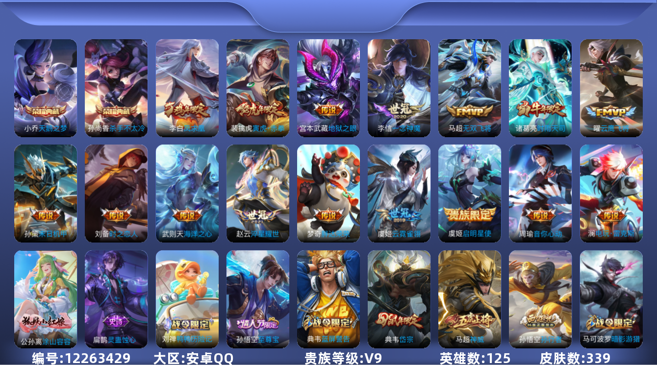 - [12075308]V9 2典藏 33传说 125英雄 462皮肤 可修改实名 优质装备:鸣剑·曳影,拾光映像(瑶典藏),黄金射手座,云鹰飞将(小将军),绛天战甲(鸡嘴战神),久胜战神,炽阳神光,末日机甲-孙尚香(绿蚂蚱),仲夏夜之梦(大飞蛾),音你心动-小乔,胖达荣荣,李逍遥,超时空战士-狄仁杰,碎云,浮生妄,鹤羽星尊,妄想奇谈,黄金天蝎座,千山共赴,涂山容容 传说皮:云诺千山,铠冥王哈迪斯,续相思,星之鸣奏,祥瑞亨通,幻光神枪 珍宝阁皮:妄想食味,胡桃夹子,女武神 限定皮:愿照·九州拓(澜年限),愿照·山河定(司空震年限),愿照·千秋盛(女娲年限),逐霄战戟,鸣野蒿,至尊宝,凤求凰(白切鸡),凤凰于飞,傲雪梅枪,绯月行,魔法小厨娘,时雨天司(水龙头),神威(电光马子),飞衡(韩信年限),遇见飞天,高山流水,诗剑行,降魔,五谷丰年,天狼运算者,梁祝,御风骁将(吕布年限),龙胆,烈魂,天狼溯光者,逐梦之音,祈雪灵祝(雪兔子),天狼绘梦者,李小龙,逐梦之影,朱雀志(守约年限),孙行者,猪悟能,大圣娶亲,引擎之心,青春决赛季,乒乒小将,蜜橘之夏,玉兔公主,时之奇旅-妲己,神器·万象笔 史诗皮:鸭鸭历险记-刘禅,苍鳞隐世,器灵·浮梦炉,糖绘人间,绮世丹青,瑰影绮梦,化蝶舞,灵蛊蚀心,星界战将,龙之律动,雪豹·霜爪,藏狐·褐绒,布丁狗之誓,百相守梦-周瑜,戍鼓铭心,茶境仙,怒海争锋,破空之剑,涂山红红,东方月初,蒙犽顽岩魄,芈月浮光幕影,琥珀纪元伽罗,上官婉儿群星魔术团,蔬乡物语(鲁班七号),超元猎域,百相守梦-百里守约,星界特工,百相守梦-黄忠,织梦人,紫霞仙子,苍穹之光,电玩小子(小书包),白龙吟,黄金分割率,特工魅影,千年之狐,江河有灵,鹤归松栖(赵怀真),真我赫兹(百里守约),魅语,百解令(蒙犽),高渐离燃音魔法,蒙恬荣光圣徽,无限星赏官,冰冠公主,青蛇,偶像歌手,白蛇,晚萤,电玩·爆裂旋风,暗夜猫娘,末日机甲-吕布,猫狗日记-孙策,猫狗日记-大乔,时之恋人-孙尚香,乱世虎臣,节奏热浪,修罗,女仆咖啡,摇滚巨星,水果甜心,绅士熊喵,天才门将,星夜王子,心灵骇客,功夫厨神,德古拉伯爵,暗隐猎兽者,幽灵船长,鬼剑武藏,暗渊魔法,心灵战警,乐园奇幻夜,天秀·启明,舞动绿茵,地狱岩魂,诗语江南,纤云弄巧,繁星吟游(呼啦呼啦),拒霜思,缤纷独角兽,乘风破浪,逐浪之夏,龙鼓争鸣,月团寄思,水晶猎
