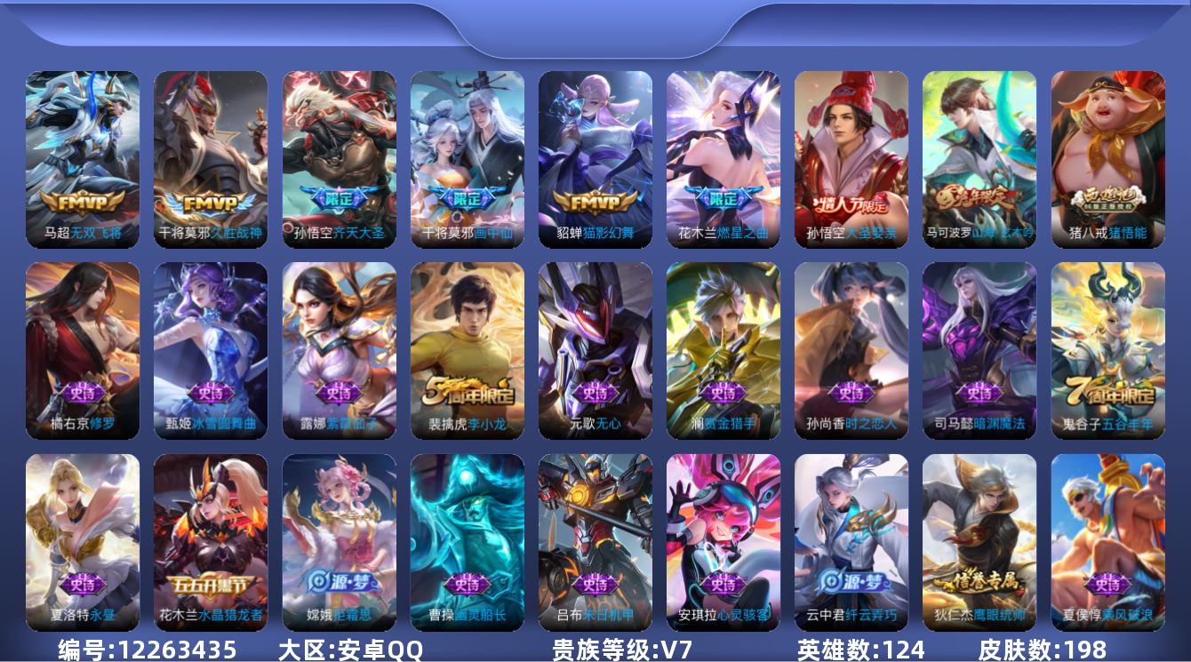 - [11298025]V10 6典藏 4无双 58传说 126英雄 445皮肤 典藏英雄武则天 可修改实名 优质装备:倪克斯神谕(宇宙婆娘),杀手不太冷,全息碎影(猴子典藏),银白咏叹调(倪克斯侍卫),幻阙歌(貂蝉典藏),弑枪猎影(韩信典藏),神器·明辉仪,青丘·九尾(妲己无双),碎月剑心(李白无双),韩信群星魔术团(韩信无双),黄金狮子座,黄金射手座,冠军飞将,云鹰飞将(小将军),绛天战甲(鸡嘴战神),猫影幻舞,久胜战神,炽阳神光,一念神魔,云霓雀翎,末日机甲-孙尚香(绿蚂蚱),地狱火,仲夏夜之梦(大飞蛾),音你心动-小乔,地狱之眼,音你心动-周瑜,胖达荣荣,李逍遥,乞巧织情,时之恋人-刘备(电焊工),游龙清影(小青龙),淬星耀世,超时空战士-狄仁杰,无双飞将,碎云,神器·明辉仪,山海·炽霜斩(李信年限),山海·苍雷引(电光曜子),炽翼辉光(娃娃菜牛角包),燃星之曲,画中仙,青丘·九尾,鹤羽星尊,妄想实况,霜月吟,澜逐花归海,艾琳觅芳踪,琥珀纪元马超 传说皮:乘龙·问璇玑(孙尚香年限) 珍宝阁皮:优雅恋人,蔷薇恋人 限定皮:鸣野蒿,夏侯惇霜北刀,至尊宝,白虎志(电光耗子),凤求凰(白切鸡),太华(伽罗年限),异界灵契(白毛香),星穹之声,绯月行,白晶晶,时雨天司(水龙头),神威(电光马子),飞衡(韩信年限),无限倾心-项羽,至美·乘鲤谣,高山流水,诗剑行,无限倾心-虞姬,齐天大圣,怒海麟威,五谷丰年,冰锋战神,武圣,梁祝,烈魂,逐梦之音,祈雪灵祝(雪兔子),天狼绘梦者,李小龙,朱雀志(守约年限),纯白花嫁,孙行者,一生所爱,天魔缭乱,青春决赛季,冰霜恋舞曲,云端筑梦师,乒乒小将,寅虎·瑞焰(虎皮蛋子),寅虎·心曲(虎婆),启示之音,深海之息(深海大菠萝),山海·玄木吟(马可年限) 史诗皮:星界战将,灵蛊蚀心,海诺心动手记,蒙犽顽岩魄,埋骨钱,怒海争锋,蔬乡物语(鲁班七号),超元猎域,琥珀纪元伽罗,遇见神鹿,紫霞仙子,苍穹之光,电玩小子(小书包),白龙吟,黄金分割率,特工魅影,千年之狐,永昼,电玩·爆裂旋风,真我赫兹(镜),浮梦罗烟,真我赫兹(百里守约),江河有灵,雪夜绮愿(周瑜),百解令(蒙犽),高渐离燃音魔法,蒙恬荣光圣徽,偶像歌手,龙骑士(小龙虾),白蛇,暗夜猫娘,魅语,无限星赏官,晚萤,冰冠公主,青蛇,末日机甲-吕布,猫狗日记-孙策,猫狗日记-大乔,时之恋人-孙尚香,乱世虎臣