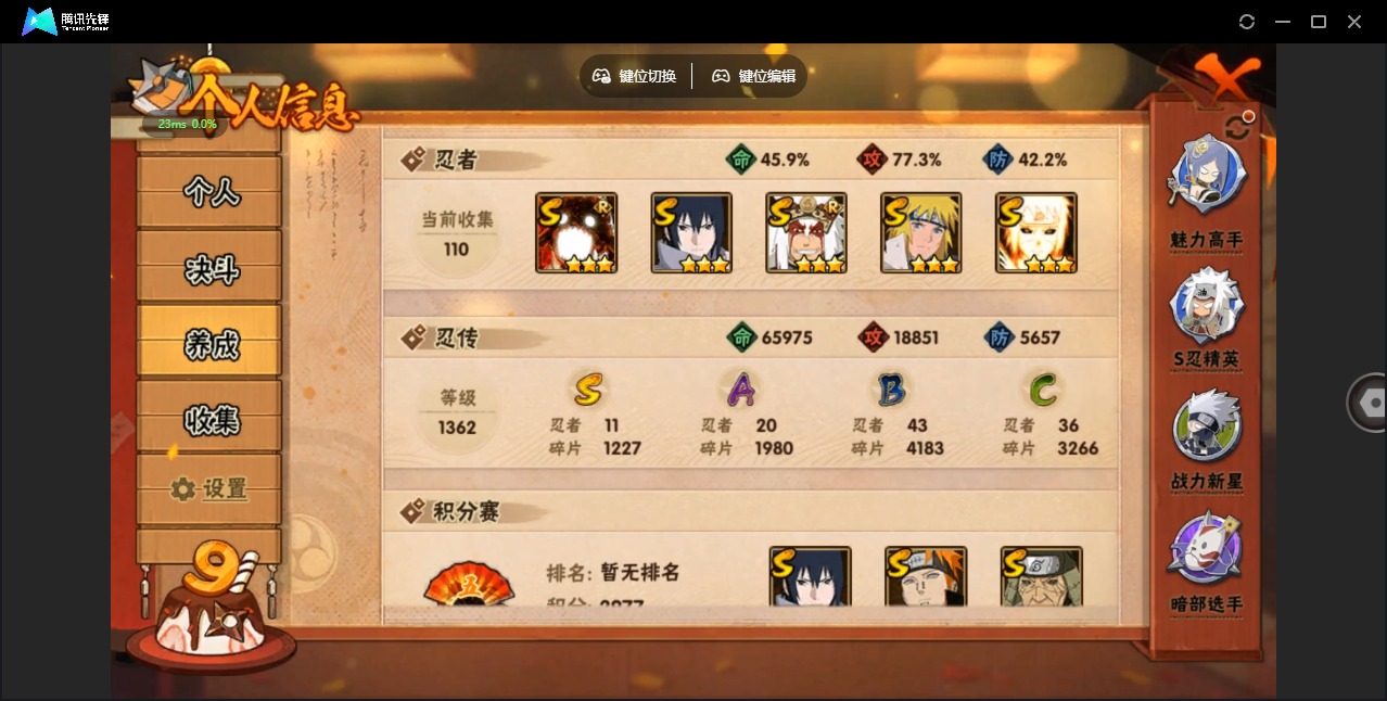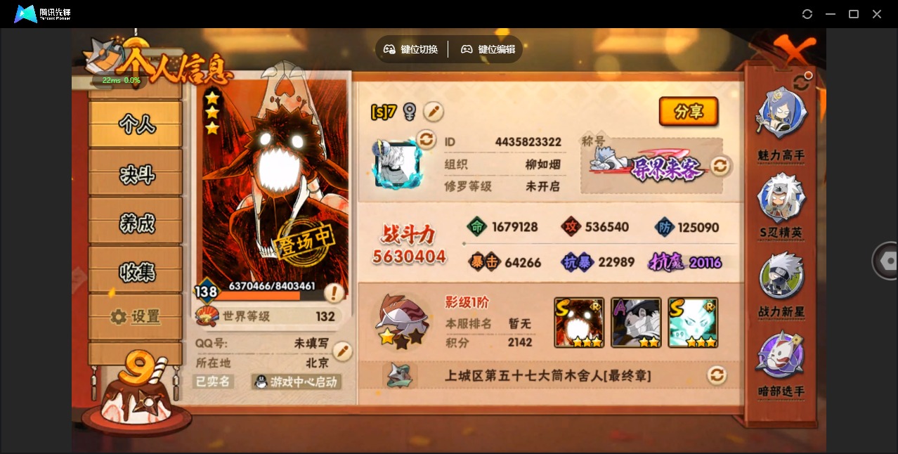 [12263469]V10 11S忍 20A忍 14通灵 563W战力 可二次 可修改实名 优质装备:猿飞日斩「秽土转生」,宇智波带土 「忍界大战」,“宇智波斑” 「白面具」,宇智波佐助「永恒万花筒」,大筒木舍人 「最终章」,漩涡鸣人 「暴怒·第六尾」 S级忍者:自来也 「舞之豪杰」,波风水门「九喇嘛连结」,宇智波鼬 「须佐能乎」,佩恩「天道」,波风水门