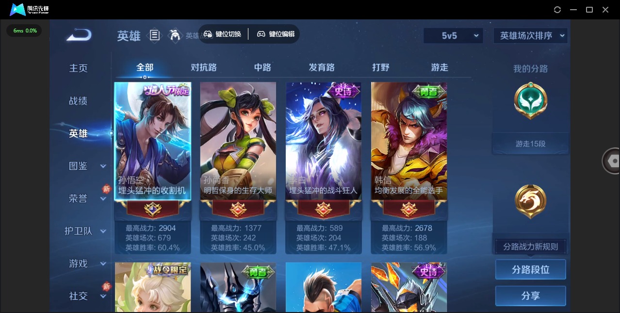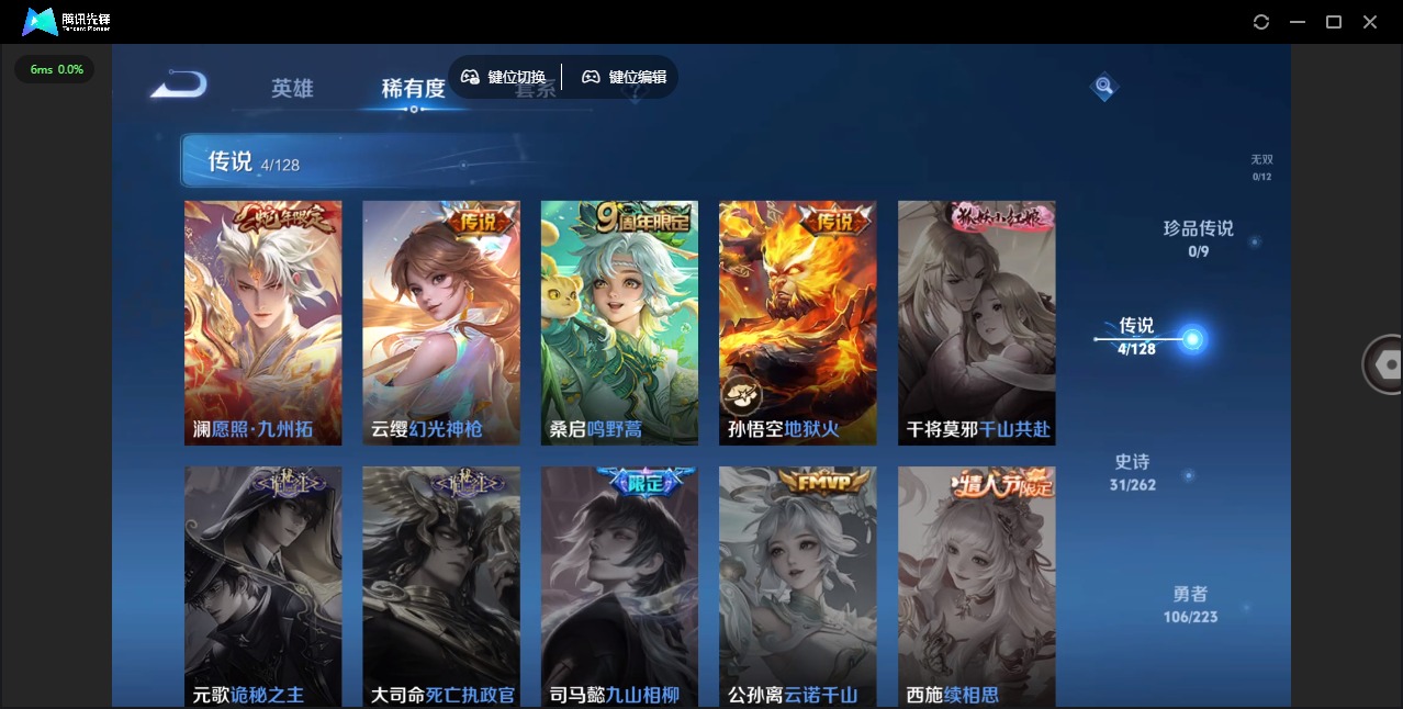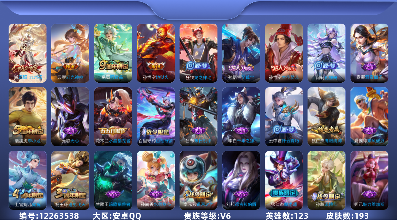 [12263538]V6 4传说 123英雄 193皮肤 可修改实名 女号 优质装备:地狱火 传说皮:幻光神枪 珍宝阁皮:胡桃夹子 限定皮:愿照·九州拓(澜年限),鸣野蒿,至尊宝,遇见飞天,梁祝,李小龙,大圣娶亲 史诗皮:化蝶舞,龙之律动,茶境仙,百相守梦-百里守约,紫霞仙子,千年之狐,冰冠公主,百解令(蒙犽),偶像歌手,末日机甲-吕布,摇滚巨星,水果甜心,天才门将,德古拉伯爵,暗隐猎兽者,乐园奇幻夜,纤云弄巧,乘风破浪,月团寄思,水晶猎龙者,鹰眼统帅,魅力维加斯,无心