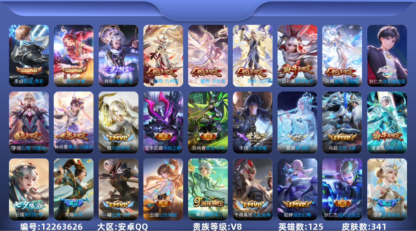 [12263626]V8 2典藏 1无双 28传说 125英雄 341皮肤 可修改实名 优质装备:鸣剑·曳影,韩信群星魔术团(韩信无双),拾光映像(瑶典藏),云鹰飞将(小将军),绛天战甲(鸡嘴战神),猫影幻舞,久胜战神,炽阳神光,一念神魔,末日机甲-孙尚香(绿蚂蚱),地狱之眼,超时空战士-狄仁杰,花朝如约(花篮子),无双飞将,山海·炽霜斩(李信年限),炽翼辉光(娃娃菜牛角包),电玩·雷克斯,鹤归松栖(云缨),夜礼服假面,霜月吟 传说皮:乘龙·问璇玑(孙尚香年限),幻光神枪 珍宝阁皮:万物之道,优雅恋人,玩趣恶龙 限定皮:愿照·九州拓(澜年限),愿照·岁时盈(虞姬年限),愿照·山河定(司空震年限),愿照·千秋盛(女娲年限),鸣野蒿,至尊宝,补天,时雨天司(水龙头),高山流水,游园惊梦,逐梦之星,岱宗(典韦年限),奔雷神使(牛魔年限),祈雪灵祝(雪兔子),李小龙,逐梦之影,默契交锋-花木兰,孙行者,猪悟能,蜜橘之夏,玉兔公主,山海·玄木吟(马可年限) 史诗皮:器灵·浮梦炉,化蝶舞,星界战将,茶境仙,怒海争锋,战舞者,东方月初,海诺心动手记,琥珀纪元伽罗,蔬乡物语(鲁班七号),紫霞仙子,黄金分割率,特工魅影,千年之狐,江河有灵,鹤归松栖(赵怀真),雪夜绮愿(周瑜),魅语,高渐离燃音魔法,蒙恬荣光圣徽,无限星赏官,冰冠公主,偶像歌手,晚萤,电玩·爆裂旋风,暗夜猫娘,百相守梦(关羽),末日机甲-吕布,猫狗日记-孙策,猫狗日记-大乔,乱世虎臣,节奏热浪,修罗,女仆咖啡,水果甜心,绅士熊喵,天才门将,星夜王子,心灵骇客,德古拉伯爵,暗隐猎兽者,幽灵船长,鬼剑武藏,暗渊魔法,心灵战警,乐园奇幻夜,地狱岩魂,纤云弄巧,拒霜思,缤纷独角兽,乘风破浪,逐浪之夏,月团寄思,水晶猎龙者,曙光守护者,箭羽风息,金属风暴,原初追逐者,圣诞狂欢,圣诞恋歌,鹰眼统帅,魅力维加斯,黎明之约,赏金猎手,未来纪元-赵云,玫瑰异探