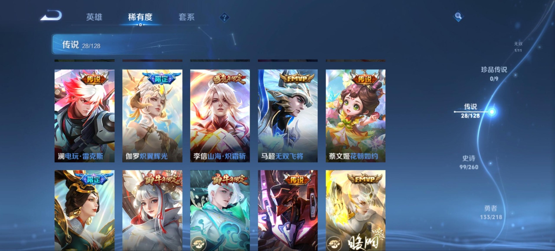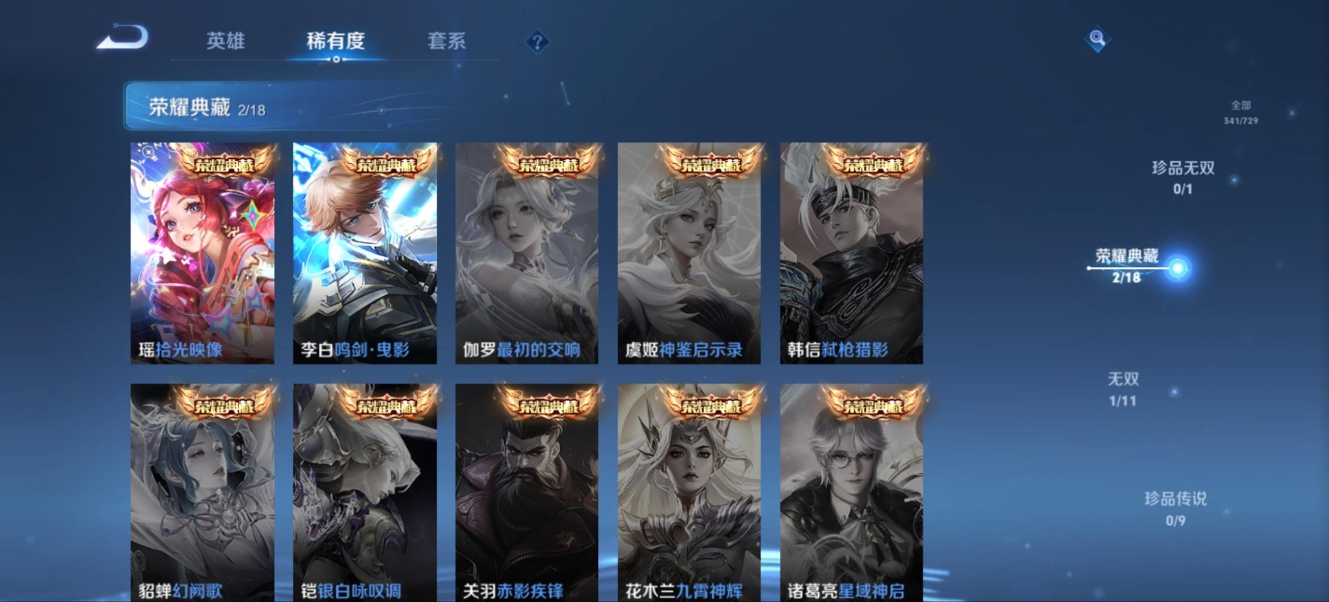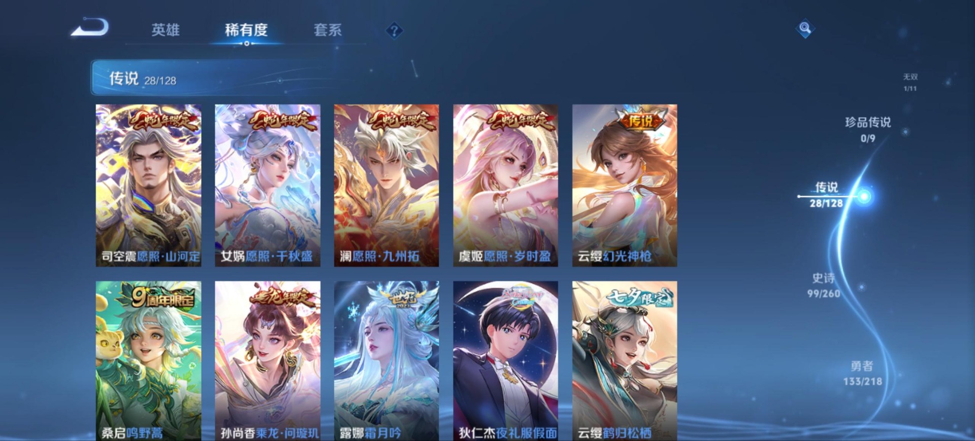 典韦岱宗,牛魔奔雷神使,诸葛亮时雨天司,公孙离祈雪灵祝,公孙离玉兔公主,司空震愿照·山河定,公孙离蜜橘之夏,裴擒虎李小龙,花木兰默契交锋,马可波罗逐梦之星,马可波罗山海·玄木吟,桑启鸣野蒿,猪八戒猪悟能,女娲补天,女娲愿照·千秋盛,孙悟空孙行者,孙悟空至尊宝,韩信逐梦之影,澜愿照·九州拓,虞姬愿照·岁时盈