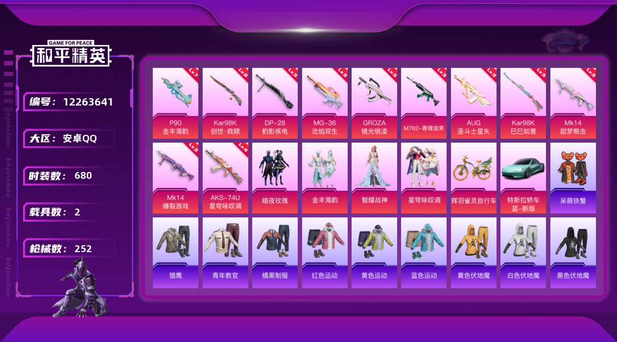 [12263641]4粉装 11特效枪 2载具 15印记 可二次 可修改实名 身法装备:暗影哥特(红眼罩),Mark.06(新蓝螳螂) 优质装备:辉羽雀灵自行车,特斯拉Roadster(水滴蓝),六级Kar98K-创世·救赎,Kar98K创世·救赎,P90-金丰海韵,七级P90-金丰海韵,M762-青锋波束,GROZA-镜光银凌,智耀战神,AUG-圣斗士星矢,星穹咏叹调,AKS-74U-星穹咏叹调,MK14-甜梦熊击,Mk14-爆裂游戏,Kar98K-巳巳如意 热门装扮:暗夜玫瑰,金丰海韵,呆萌铁蟹 稀有枪皮:MG-36-沧焰双生,DP-28-豹影疾电 五级特效枪:五级M762-青锋波束,五级GROZA-镜光银凌,五级Kar98K-巳巳如意,五级m14爆裂游戏,五级DP-28-豹影疾电,五级MG-36-沧焰双生,五级MK14-甜梦熊击,五级AUG-圣斗士星矢 四级特效枪:四级AKS-74U-星穹咏叹调 紫色装扮:SS23特训,虚空漩涡,SS30特训套装,SS31特训套装,云朵鹅,雪绒豹,SS33特训套装,旭日情侣,诡诞巡游,SS21特训,田园牧歌,轻风白浪,和煦暖阳,SS22特训,顶瓜瓜,混沌火种,冷焰舞者,吉莉礼服,夏日音浪,完美偶像,帅气教官,幻影武者,冰川特警,灵公主,人气偶像,SS16特训,瑞龙福将,团圆交子,SS17特训,治愈之星,科技之星,SS14特训,萌趣颜团子,特种颜团子,青春冒险家,潮流游乐家,SS15特训,蝎王蛇后,SS20特训,竞技角斗士,异彩先驱,SS18特训,SS19特训,战地菁英,黄色名流,青年教官,风暴特警,飞行日记,骑行爱好者,魅力单车,鹤鸣,麻辣教官,黄色伏地魔,黄色运动,黑色伏地魔,龙的传人,龟仙人,冰河战士,龙魂突击队,蝶变,酷潮明星,霓虹极客,野性战心,长空猛禽,雨林探路者,银刃勇者大衣,熔岩游骑兵连帽夹克,无面战甲,绛羽幽主,街头潮人,深蓝色名流,湖蓝色名流,灰色格斗者,灼焰舞者,炫蓝之夏,热血青春,牛气冲天,牛气满满,海岛探路者,战地督导,探宝勇士,极地朋克,柠萌假日,格斗先锋,橘黑制服,沙漠毒蛇,竞技达人朋克,红色运动,绮丽涂鸦,缤纷果语,蓝彩潮人,蓝色运动,虎虎生威吉莉,空投萌叽,特殊使命,特训学院,狂沙舞者,猎鹰,猛禽,王牌教练,甜蜜告白,甜蜜熊情侣,空岛之星,白熊同盟,白色伏地魔,破晓战魂,破蛋小黄鸡,福星高照,萝兰蝴蝶,SS2