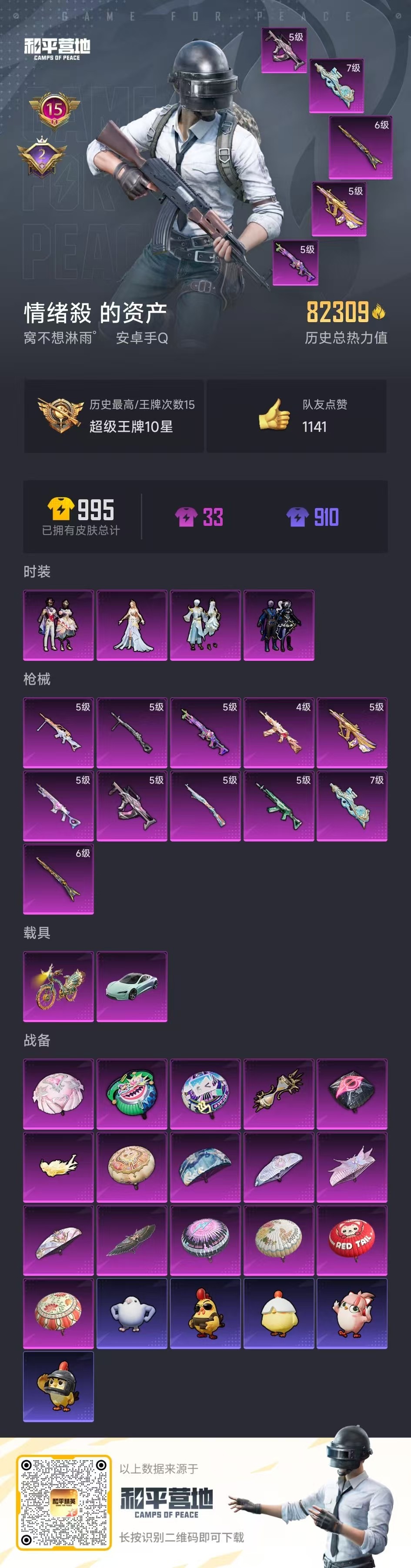 - PX_2094989- 安卓手Q-10王牌印记-8粉装-14特效枪-8载具-77657热力值-136套装-203枪皮-4卓越印记-1传奇印记 【8粉装】,洛天依,幻海仙踪,星穹咏叹调,千金淑猫,星之信仰,圣堂之誓,创世·救赎,烟云彩露 【14特效枪】AKM-绿萝繁花-5级 SCAR-L-锦绣绵绵-5级 M416-电玩时刻-5级 GROZA-镜光银凌-5级 AUG-暖羊咩咩-5级 Kar98K-创世