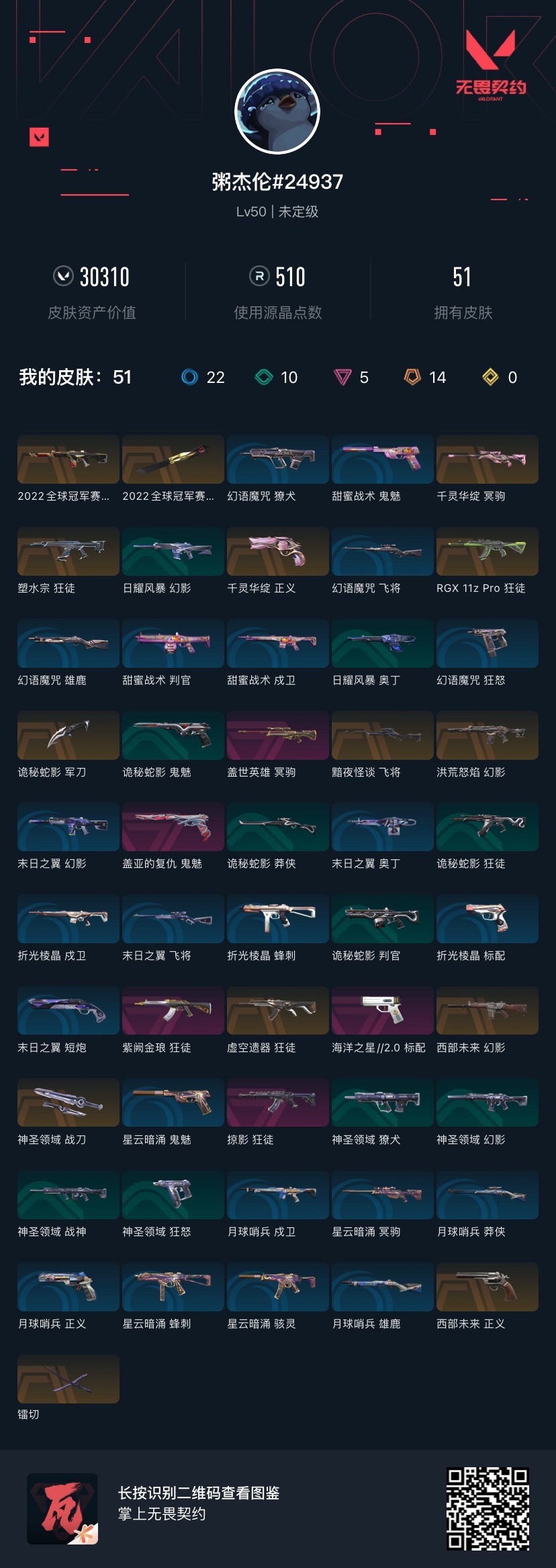 [12263636]14橙皮 5紫皮 51皮肤 17英雄 50卡面 510已用源晶 未定级 优质装备:狂徒-塑水宗,冥驹-千灵华绽,狂徒-掠影,狂徒-紫阙金琅,幻影-洪荒怒焰,正义-千灵华绽,鬼魅-盖亚的复仇,镭切,神圣领域 战刀,诡秘蛇影 亮点皮肤:幻影-2022全球冠军赛,2022全球冠军赛 蝴蝶刀 套装:2022全球冠军赛 佩枪皮肤:标配-海洋之星2.0,正义-西部未来 步枪皮肤:RGX 11z pro 狂徒,狂徒-虚空遗器,幻影-西部未来 狙击枪皮肤:飞将-黯夜怪谈,冥驹-盖世英雄