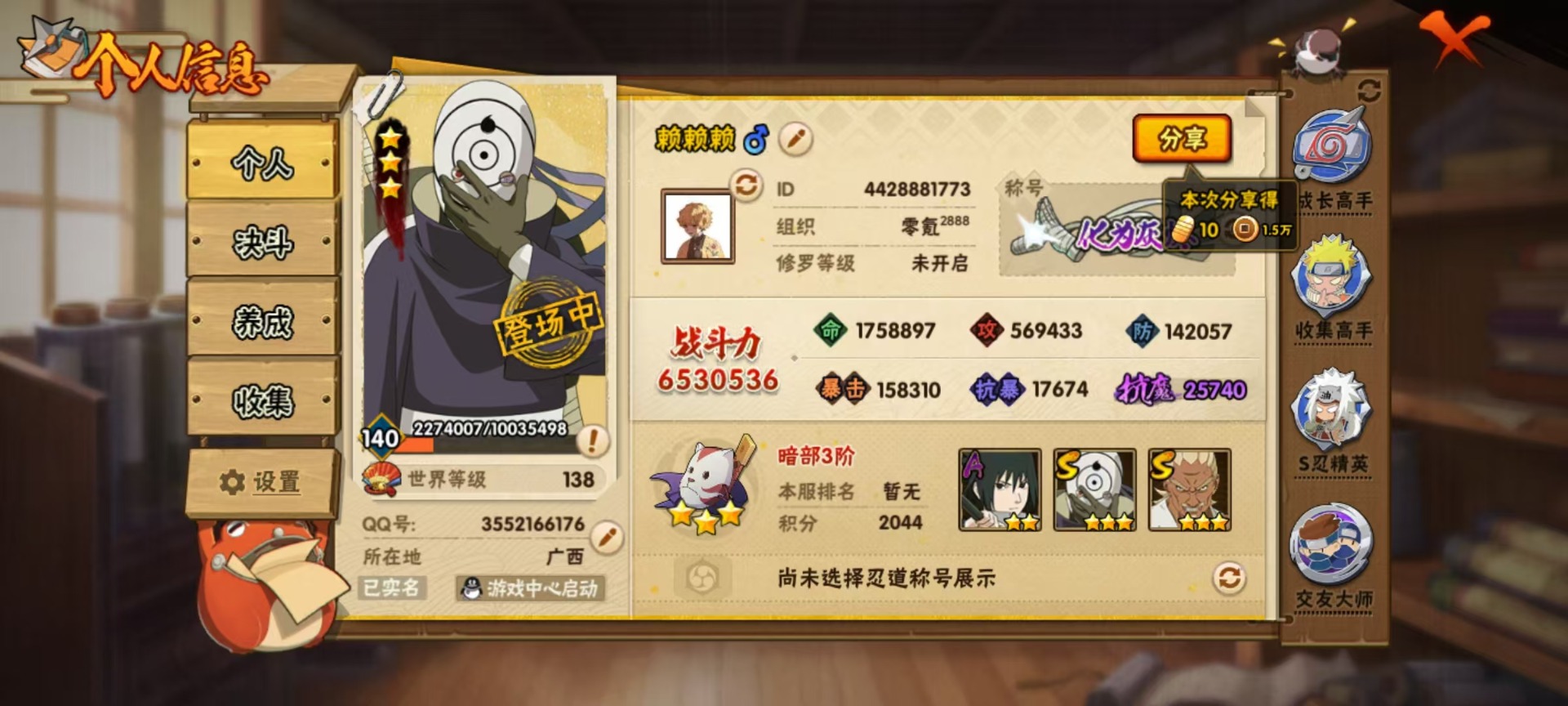 [12263739]V9 16S忍 23A忍 14通灵 653W战力 可二次 可修改实名 优质装备:千手柱间「秽土转生」,药师兜「仙人模式」,宇智波斑 「木叶创立」,宇智波带土 「忍界大战」,“宇智波斑” 「白面具」,漩涡鸣人 「九喇嘛连结」,神秘面具男 「红夜之刃」,宇智波佐助「永恒万花筒」,宇智波斑「秽土转生·解」,艾「忍界大战」 S级忍者:大野木 「忍界大战」,自来也 「舞之豪杰」,宇智波鼬 「须佐能乎」,波风水门,大蛇丸,纲手