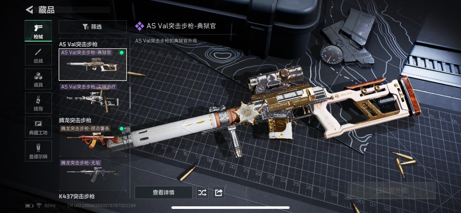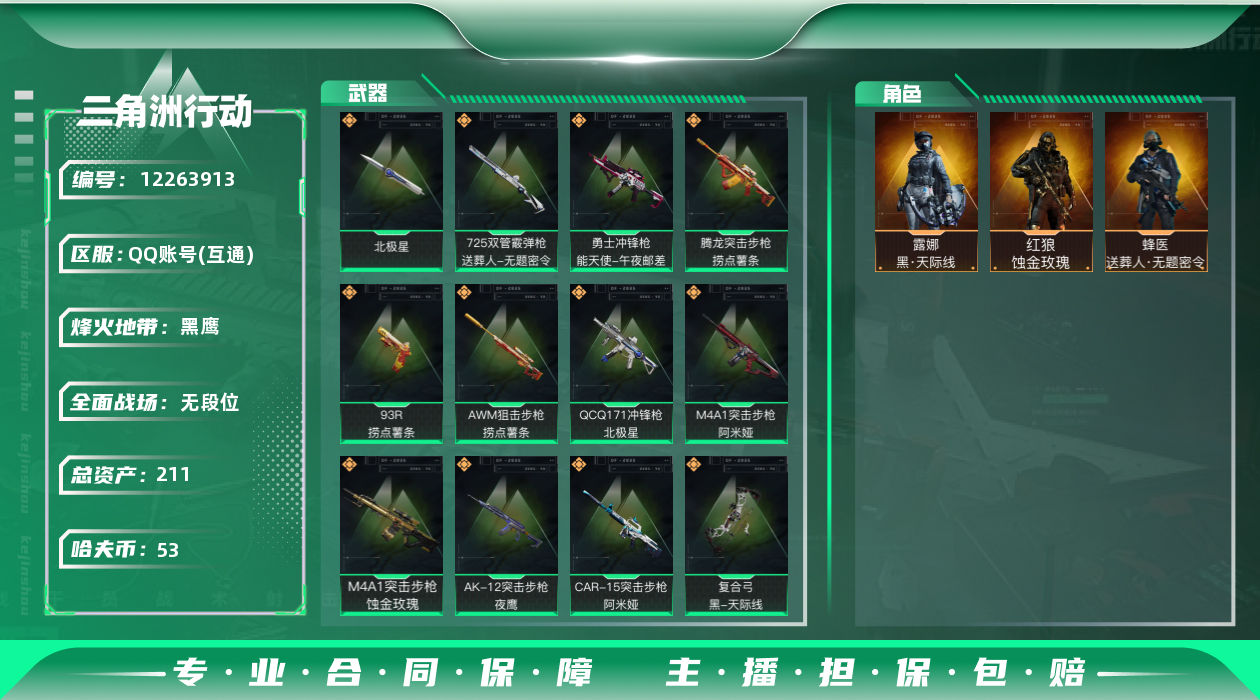[12263913]总资产:211.7M 3干员外观 1近战传说 13传说枪械 哈夫币:53.918K 高级安全箱(9.17到期) 可二次 可修改实名 优质装备:近战-北极星 烽火地带段位:黑鹰 全面战场段位:无段位 传说武器皮肤:AWM狙击步枪-捞点薯条,腾龙突击步枪-捞点薯条,93R-捞点薯条,勇士冲锋枪-能天使-午夜邮差,复合弓-黑-天际线,K437突击步枪-北极星,QCQ171冲锋枪-北极星,725双管霰弹枪-送葬人-无题密令,M4A1突击步枪-阿米娅,CAR-15突击步枪-阿米娅,AK-12突击步枪-夜鹰,M4A1突击步枪-蚀金玫瑰 史诗武器皮肤:Ash-12战斗步枪-守夜人,M16A4突击步枪-竞赛选手,PKM通用机枪-守夜人,AS Val突击步枪-尖端治疗,M700狙击步枪-守夜人,SG552突击步枪-尖端治疗,SR-25射手步枪-尖端治疗,M1014霰弹枪-林中猎手,勇士冲锋枪-深海恐惧,AKM突击步枪-林中猎手,SV-98狙击步枪-林中猎手,PTR-32突击步枪-英雄,AS Val突击步枪-典狱官,PKM通用机枪-荒野求生,SCAR-H战斗步枪-囚徒,腾龙突击步枪-无垢,MP7冲锋枪-无垢,PSG-1射手步枪-无垢,SVD狙击步枪-荒野求生,SR-3M紧凑突击步枪-荒野求生,QBZ95-1突击步枪-曙光,Vector冲锋枪-阿萨拉文明,S12K霰弹枪-曙光,M700狙击步枪-竞技风 干员外观:红狼-蚀金玫瑰,蜂医-送葬人·无题密令(S5),露娜-黑·天际线