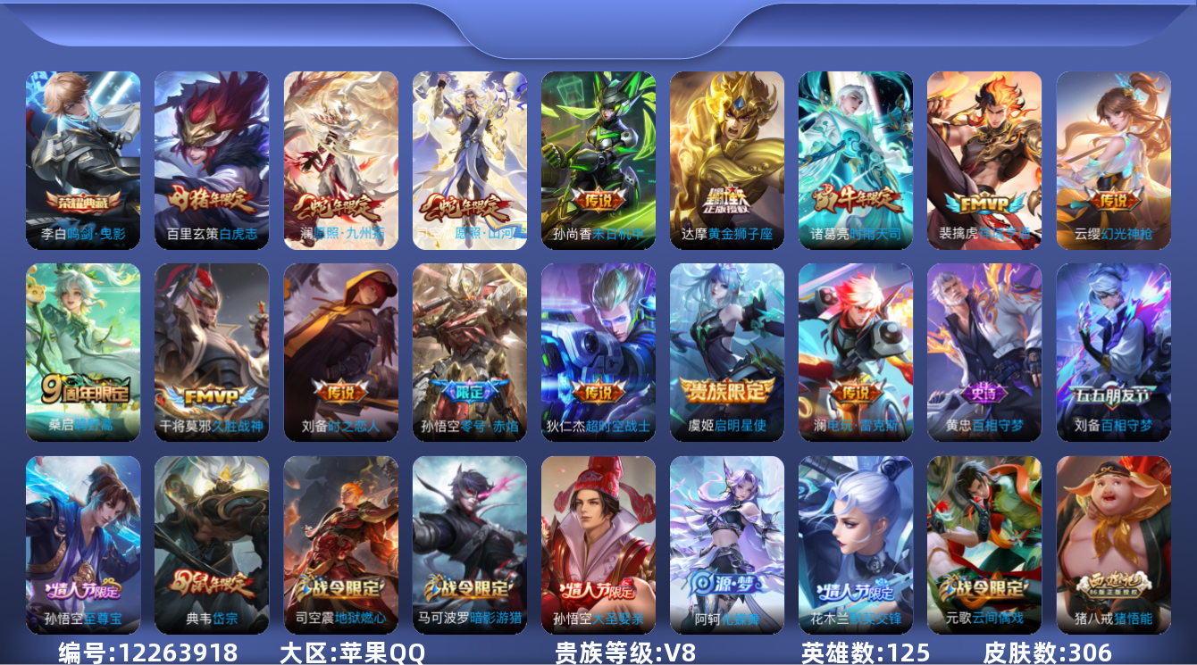 [12263918]V8 1典藏 15传说 125英雄 306皮肤 可修改实名 刘备小国标 优质装备:鸣剑·曳影,黄金狮子座,久胜战神,末日机甲-孙尚香(绿蚂蚱),零号·赤焰,时之恋人-刘备(电焊工),超时空战士-狄仁杰,电玩·雷克斯 传说皮:祥瑞亨通,幻光神枪 珍宝阁皮:妄想食味,玩趣恶龙 限定皮:愿照·九州拓(澜年限),愿照·山河定(司空震年限),鸣野蒿,至尊宝,白虎志(电光耗子),时雨天司(水龙头),遇见飞天,高山流水,五谷丰年,梁祝,天狼狩猎者,岱宗(典韦年限),李小龙,默契交锋-花木兰,猪悟能,大圣娶亲,美猴王,时之祈愿-云中君 史诗皮:器灵·浮梦炉,化蝶舞,茶境仙,百相守梦-黄忠,紫霞仙子,苍穹之光,电玩小子(小书包),白龙吟,特工魅影,千年之狐,永昼,江河有灵,百解令(蒙犽),高渐离燃音魔法,蒙恬荣光圣徽,无限星赏官,白蛇,电玩·兔顽号,百相守梦(刘备),暗夜猫娘,龙骑士(小龙虾),末日机甲-吕布,猫狗日记-孙策,乱世虎臣,节奏热浪,摇滚巨星,水果甜心,星夜王子,功夫厨神,德古拉伯爵,暗隐猎兽者,幽灵船长,鬼剑武藏,心灵战警,乐园奇幻夜,舞动绿茵,地狱岩魂,纤云弄巧,繁星吟游(呼啦呼啦),拒霜思,缤纷独角兽,乘风破浪,逐浪之夏,月团寄思,水晶猎龙者,曙光守护者,箭羽风息,金属风暴,原初追逐者,圣诞狂欢,圣诞恋歌,鹰眼统帅,魅力维加斯,黎明之约,赏金猎手,无心,未来纪元-赵云