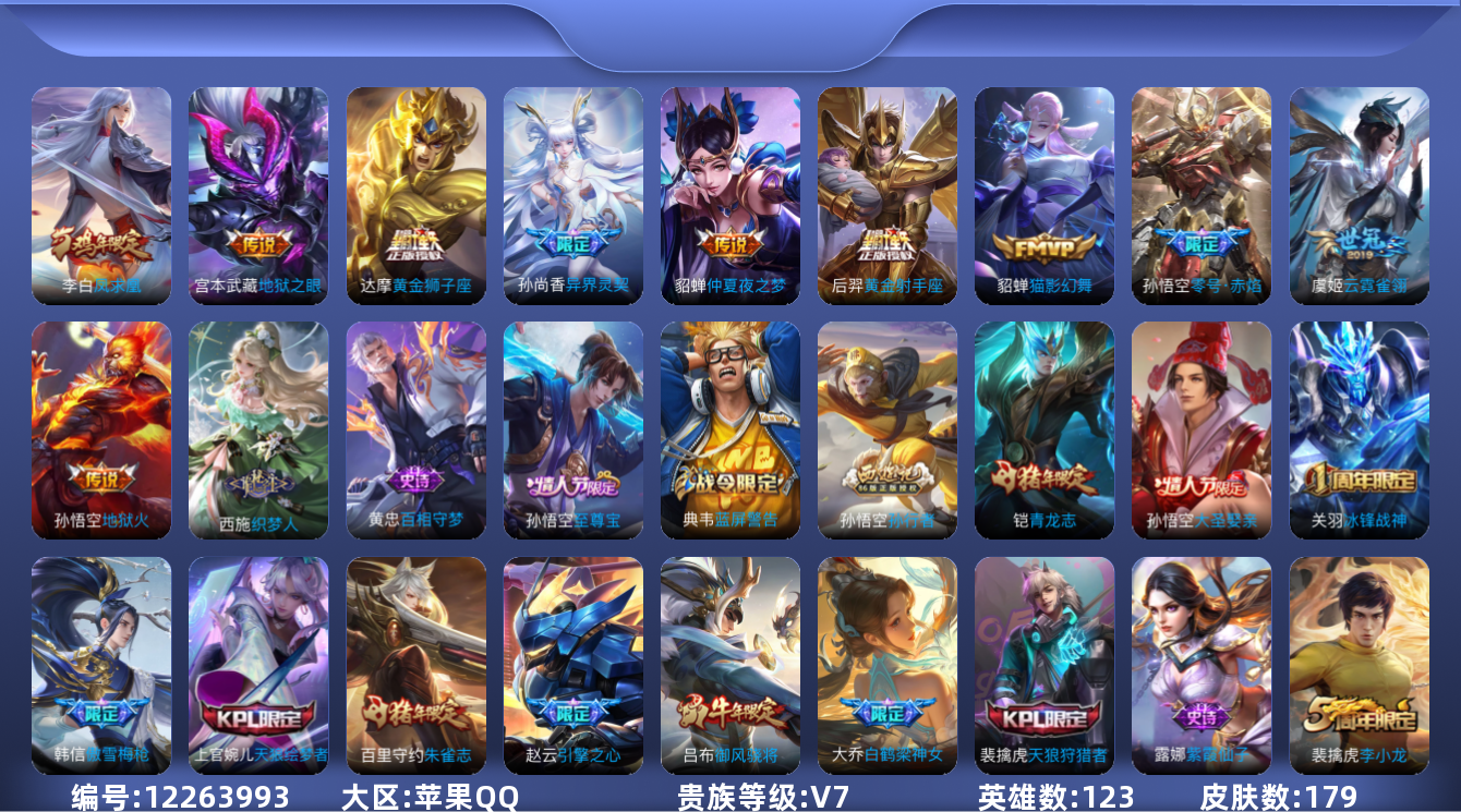 - PX_2097221-41 苹果QQ/尊贵铂金/289皮肤/125英雄/1典藏/0珍品无双/0无双/0珍品传说/16传说/89史诗/9稀有英雄 【1 典藏皮肤】星域神启 诸葛亮, 【16 传说皮肤】武圣 关羽,启明星使 虞姬,白虎志 百里玄策,零号·赤焰 孙悟空,游龙清影 西施,凤求凰 李白,遇见胡旋 貂蝉,地狱之眼 宫本武藏,海洋之心 武则天,时雨天司 诸葛亮,末日机甲 孙尚香,一念神魔 李信,