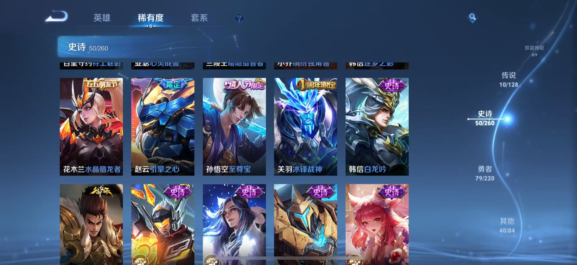 大乔白鹤梁神女,铠青龙志,孙尚香异界灵契,吕布御风骁将,裴擒虎李小龙,裴擒虎天狼狩猎者,上官婉儿梁祝,上官婉儿天狼绘梦者,花木兰瑞麟志,孙悟空孙行者,孙悟空大圣娶亲,孙悟空至尊宝,孙悟空美猴王,赵云引擎之心,韩信傲雪梅枪,韩信逐梦之影,百里守约朱雀志,关羽冰锋战神