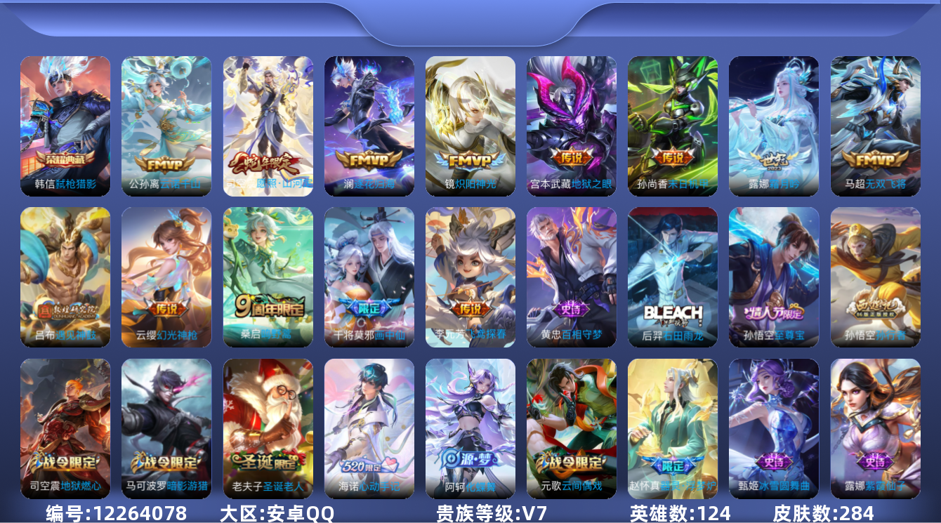 - [12027887]V7 1典藏 9传说 124英雄 276皮肤 可修改实名 优质装备:神鉴启示录,末日机甲-孙尚香(绿蚂蚱),超时空战士-狄仁杰,山海·炽霜斩(李信年限),惊梅引,涂山容容 传说皮:幻光神枪 珍宝阁皮:妄想食味,优雅恋人,蔷薇恋人 限定皮:愿照·九州拓(澜年限),逐霄战戟,鸣野蒿,傲雪梅枪,时雨天司(水龙头),神威(电光马子),遇见飞天,高山流水,五谷丰年,青龙志(铠年限),游园惊梦,梁祝,李小龙,猪悟能,大圣娶亲,寅虎·御盾(廉颇年限),寅虎·赤拳(老虎年限),山海·玄木吟(马可年限) 史诗皮:器灵·浮梦炉,星界战将,龙之律动,雪豹·霜爪,石田雨龙,茶境仙,破空之剑,蔬乡物语(鲁班七号),遇见神鹿,紫霞仙子,特工魅影,千年之狐,江河有灵,百解令(蒙犽),蒙恬荣光圣徽,偶像歌手,电玩·爆裂旋风,末日机甲-吕布,猫狗日记-孙策,乱世虎臣,节奏热浪,水果甜心,天才门将,功夫厨神,暗隐猎兽者,鬼剑武藏,暗渊魔法,纤云弄巧,乘风破浪,逐浪之夏,水晶猎龙者,曙光守护者,箭羽风息,金属风暴,原初追逐者,圣诞狂欢,鹰眼统帅,魅力维加斯,黎明之约,寅虎·御盾,无心,未来纪元-赵云
