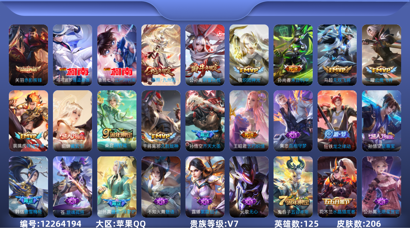 [12264194]V7 1典藏 2珍品传说 12传说 125英雄 206皮肤 可修改实名 优质装备:赤影疾锋,江户川柯南,怪盗基德,云鹰飞将(小将军),久胜战神,炽阳神光,末日机甲-孙尚香(绿蚂蚱),乞巧织情,无双飞将 传说皮:貂蝉曦玄引,祥瑞亨通 珍宝阁皮:胡桃夹子,蔷薇恋人 限定皮:愿照·九州拓(澜年限),鸣野蒿,至尊宝,傲雪梅枪,齐天大圣,五谷丰年,祈雪灵祝(雪兔子) 史诗皮:器灵·浮梦炉,狼魂孤将,龙之律动,茶境仙,百相守梦-黄忠,蒙犽顽岩魄,超元猎域,紫霞仙子,黄金分割率,特工魅影,千年之狐,冰冠公主,江河有灵,高渐离燃音魔法,蒙恬荣光圣徽,魅语,无限星赏官,偶像歌手,末日机甲-吕布,乱世虎臣,节奏热浪,女仆咖啡,摇滚巨星,水果甜心,天才门将,星夜王子,德古拉伯爵,鬼剑武藏,乐园奇幻夜,舞动绿茵,地狱岩魂,拒霜思,缤纷独角兽,乘风破浪,水晶猎龙者,金属风暴,圣诞恋歌,鹰眼统帅,无心