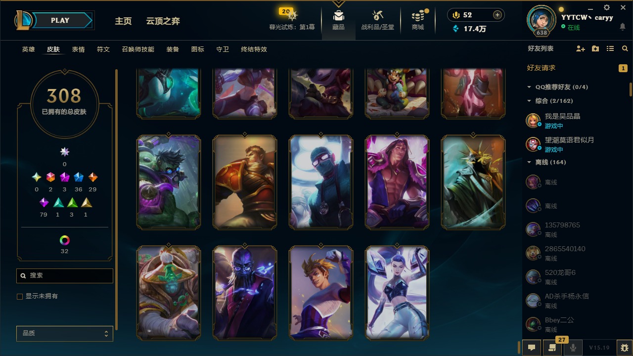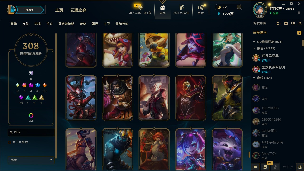 [12264195]2终极 3神话 36限定 29传说 79史诗 308皮肤 46炫彩 171英雄 可二次 可修改实名 优质装备:源代码 乐芙兰,防爆天使 凯尔,暗影 沃里克,都铎王朝 图奇,冠军之血 希瓦娜,警用试作体K-9 内瑟斯,蓝色忧郁 崔斯特,女猎手 希维尔,糖果使徒 费德提克,征服者 韦鲁斯,大元素使,灵魂守卫,天煞 劫 恒星游历者,无畏骑士 瑟庄妮 赤子初心,可爱可爱粉红红 布里茨,咖啡甜心 璐璐 焦糖布丁,十五周年纪念 希维尔,暗裔英雄 盖伦 赛季限定皮:胜利凤凰 艾尼维亚,胜利之运 崔斯特,胜利剑圣 易,胜利女神 娑娜,胜利巨口 克格莫,胜利之王 泰达米尔,胜利枪神 格雷福斯,胜利女神 奥利安娜,胜利之剑 剑魔,胜利枪神 卢锡安,胜利机器人 布里茨 冠军限定系列:S1FNC 嘉文四世,S1FNC 库奇,S10 DWG 烬 冰雪节限定:“主人不要我了” 阿木木,冰雪节 炼金,魄罗骑士 瑟庄妮,圣诞开心鬼 提莫,圣诞老人 酒桶,圣诞玩偶 波比,冰雪节 茂凯,英勇玩具兵船长 泳池派对:泳池派对 吉格斯,海之歌 泽丽 万圣节限定:无头骑士 人马 年限:天龙之子 斯莫德 周年:10周年 安妮
