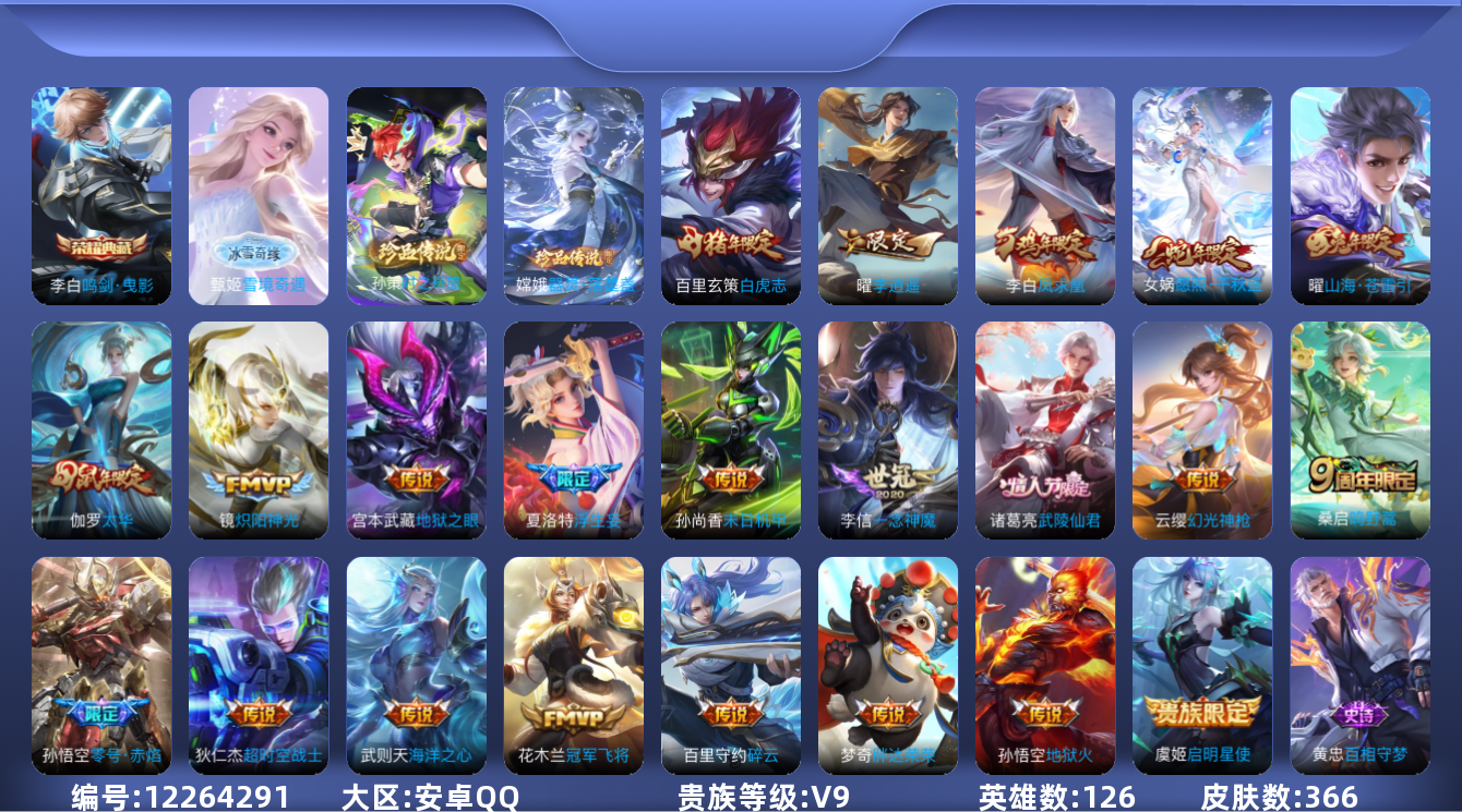 [12264291]V9 1典藏 1无双 2珍品传说 22传说 126英雄 366皮肤 典藏英雄武则天 可修改实名 优质装备:鸣剑·曳影,雪境奇遇-甄姬,器灵·落星盏,冠军飞将,炽阳神光,一念神魔,末日机甲-孙尚香(绿蚂蚱),地狱火,零号·赤焰,海洋之心,地狱之眼,胖达荣荣,李逍遥,超时空战士-狄仁杰,碎云,山海·苍雷引(电光曜子),浮生妄 珍品传说:时之奇旅-孙策 传说皮:幻光神枪 珍宝阁皮:万物之道,蔷薇恋人,女武神 限定皮:愿照·千秋盛(女娲年限),鸣野蒿,至尊宝,白虎志(电光耗子),凤求凰(白切鸡),太华(伽罗年限),武陵仙君(小桃花),傲雪梅枪,神威(电光马子),飞衡(韩信年限),玄嵩(庄周年限),遇见飞天,高山流水,五谷丰年,青龙志(铠年限),冰锋战神,幽恒(沐浴露),梁祝,御风骁将(吕布年限),岱宗(典韦年限),逐梦之音,李小龙,逐梦之影,玄武志(苏烈年限),朱雀志(守约年限),如梦令-后羿,霸王别姬-项羽,霸王别姬-虞姬,默契交锋-花木兰,孙行者,猪悟能,大圣娶亲,引擎之心,冰霜恋舞曲 史诗皮:器灵·浮梦炉,瑰影绮梦,化蝶舞,龙之律动,灵蛊蚀心,星界战将,茶境仙,百相守梦-黄忠,百相守梦-百里守约,紫霞仙子,电玩小子(小书包),白龙吟,黄金分割率,特工魅影,千年之狐,冰冠公主,江河有灵,百解令(蒙犽),蒙恬荣光圣徽,魅语,无限星赏官,晚萤,偶像歌手,龙骑士(小龙虾),暗夜猫娘,猫狗日记-孙策,猫狗日记-大乔,乱世虎臣,节奏热浪,修罗,女仆咖啡,摇滚巨星,水果甜心,绅士熊喵,天才门将,星夜王子,心灵骇客,时之奇旅-安琪拉,功夫厨神,德古拉伯爵,暗隐猎兽者,幽灵船长,鬼剑武藏,心灵战警,乐园奇幻夜,舞动绿茵,地狱岩魂,纤云弄巧,繁星吟游(呼啦呼啦),拒霜思,缤纷独角兽,乘风破浪,逐浪之夏,月团寄思,水晶猎龙者,箭羽风息,金属风暴,原初追逐者,圣诞狂欢,圣诞恋歌,鹰眼统帅,暗夜贵公子,魅力维加斯,黎明之约,赏金猎手,未来纪元-赵云
