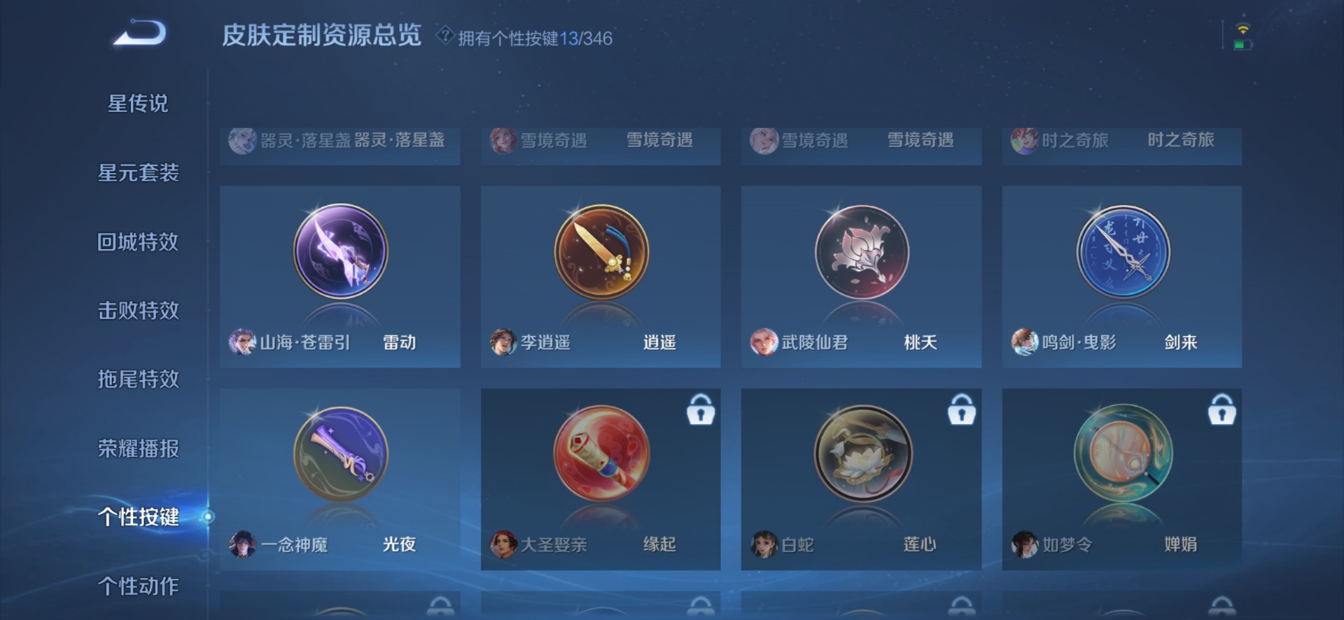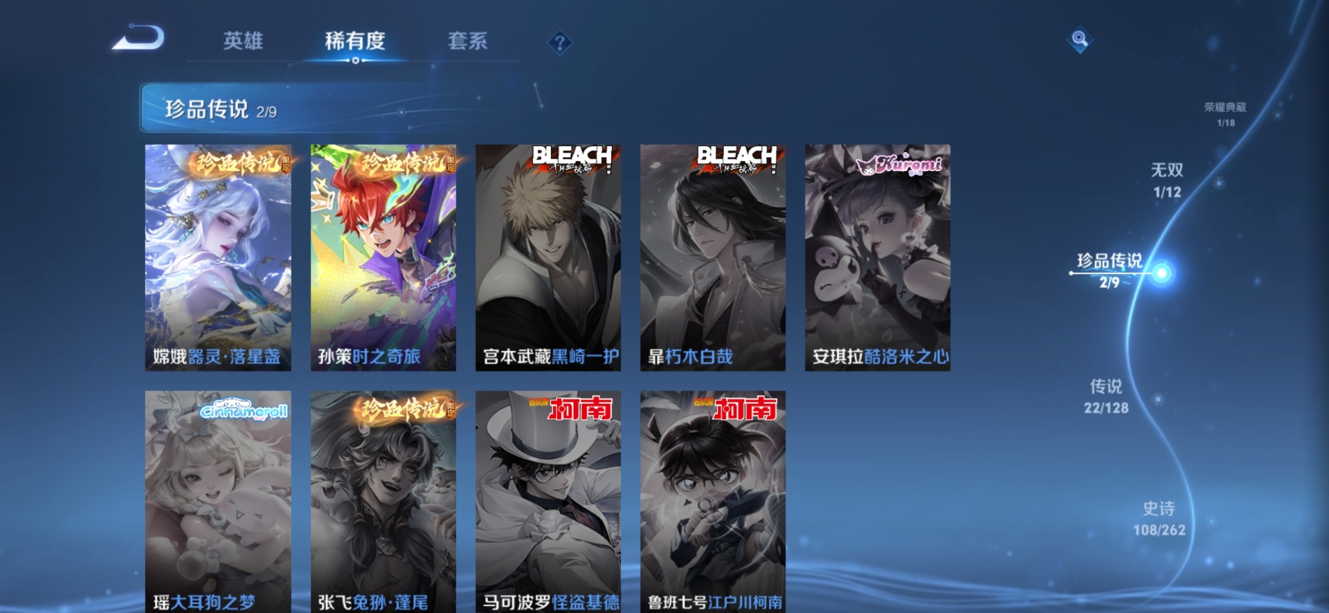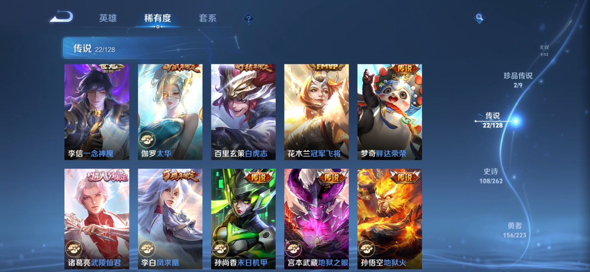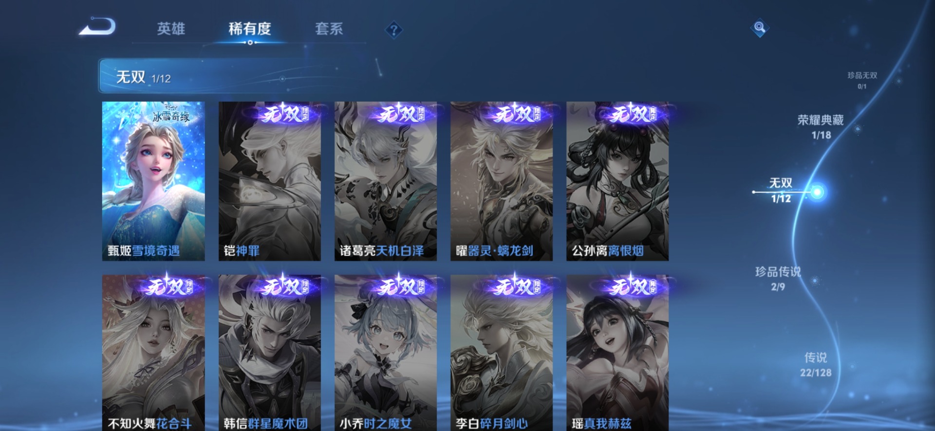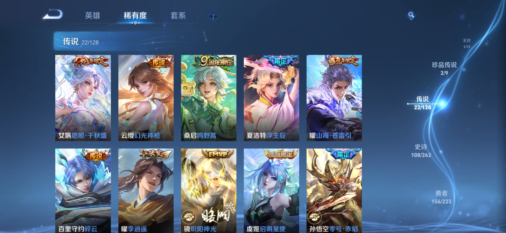 甄姬幽恒,铠青龙志,伽罗太华,苏烈玄武志,干将莫邪冰霜恋舞曲,典韦岱宗,项羽霸王别姬,吕布御风骁将,后羿如梦令,庄周玄嵩,貂蝉逐梦之音,裴擒虎李小龙,上官婉儿梁祝,花木兰默契交锋,桑启鸣野蒿,猪八戒猪悟能,女娲愿照·千秋盛,孙悟空孙行者,孙悟空大圣娶亲,孙悟空至尊宝,百里玄策白虎志,马超神威,赵云引擎之心,韩信傲雪梅枪,韩信飞衡,韩信逐梦之影,百里守约朱雀志,虞姬霸王别姬,关羽冰锋战神