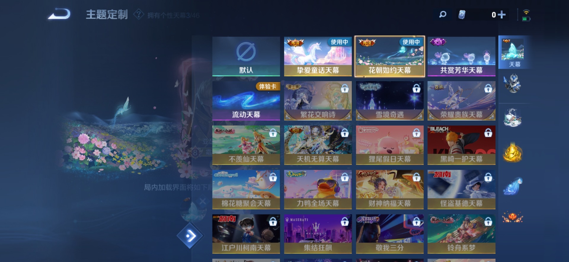 大乔猫狗日记,刘邦德古拉伯爵,夏侯惇乘风破浪,阿轲暗夜猫娘,阿轲节奏热浪,曹操幽灵船长,伽罗箭羽风息,廉颇地狱岩魂,小乔缤纷独角兽,孙策猫狗日记,不知火舞魅语,赵怀真器灵·浮梦炉,鲁班七号电玩小子,吕布圣诞狂欢,露娜紫霞仙子,诸葛亮黄金分割率,刘禅天才门将,刘禅绅士熊喵,宫本武藏鬼剑武藏,公孙离无限星赏官,兰陵王暗隐猎兽者,貂蝉圣诞恋歌,花木兰水晶猎龙者,李白千年之狐,安琪拉心灵骇客,蒙犽百解令,安琪拉时之奇旅,白起星夜王子,亚瑟心灵战警,嬴政摇滚巨星,嬴政暗夜贵公子,程咬金功夫厨神,百里玄策原初追逐者,雅典娜冰冠公主,雅典娜黎明之约,韩信白龙吟,百里守约特工魅影,李元芳逐浪之夏,墨子龙骑士,墨子金属风暴,蔡文姬舞动绿茵,澜赏金猎手,娜可露露晚萤,王昭君偶像歌手,嫦娥拒霜思,钟馗乐园奇幻夜,橘右京修罗