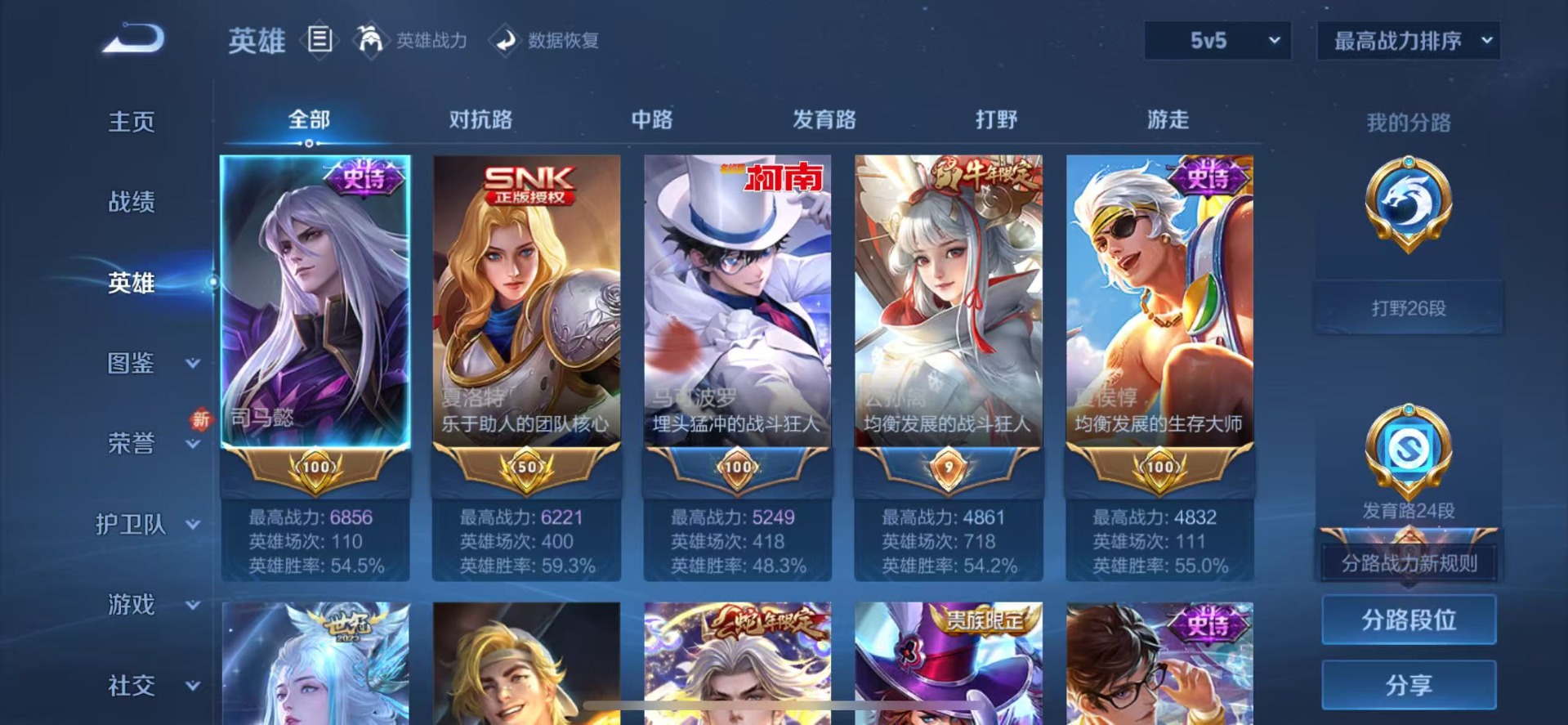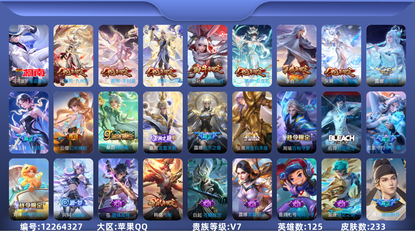 [12264327]V7 1珍品传说 14传说 125英雄 233皮肤 可修改实名 优质装备:怪盗基德,黄金白羊座,霜月吟,玄雷天君 传说皮:星之鸣奏,幻光神枪 珍宝阁皮:蔷薇恋人 限定皮:愿照·九州拓(澜年限),愿照·岁时盈(虞姬年限),愿照·山河定(司空震年限),愿照·众生和(妲己年限),愿照·千秋盛(女娲年限),鸣野蒿,凤求凰(白切鸡),飞衡(韩信年限),遇见飞天,五谷丰年,游园惊梦,梁祝,祈雪灵祝(雪兔子),李小龙,启示之音 史诗皮:鸭鸭历险记-刘禅,苍鳞隐世,糖绘人间,狼魂孤将,绮世丹青,化蝶舞,雪豹·霜爪,星界战将,石田雨龙,百相守梦-周瑜,茶境仙,谪仙醉月,星界特工,破空之剑,百相守梦-百里守约,紫霞仙子,电玩小子(小书包),黄金分割率,特工魅影,千年之狐,无限星赏官,猫狗日记-孙策,节奏热浪,女仆咖啡,摇滚巨星,水果甜心,心灵骇客,功夫厨神,暗隐猎兽者,幽灵船长,鬼剑武藏,暗渊魔法,地狱岩魂,纤云弄巧,缤纷独角兽,乘风破浪,逐浪之夏,水晶猎龙者,曙光守护者,金属风暴,原初追逐者,圣诞狂欢,圣诞恋歌,鹰眼统帅,暗夜贵公子,无心,未来纪元-赵云