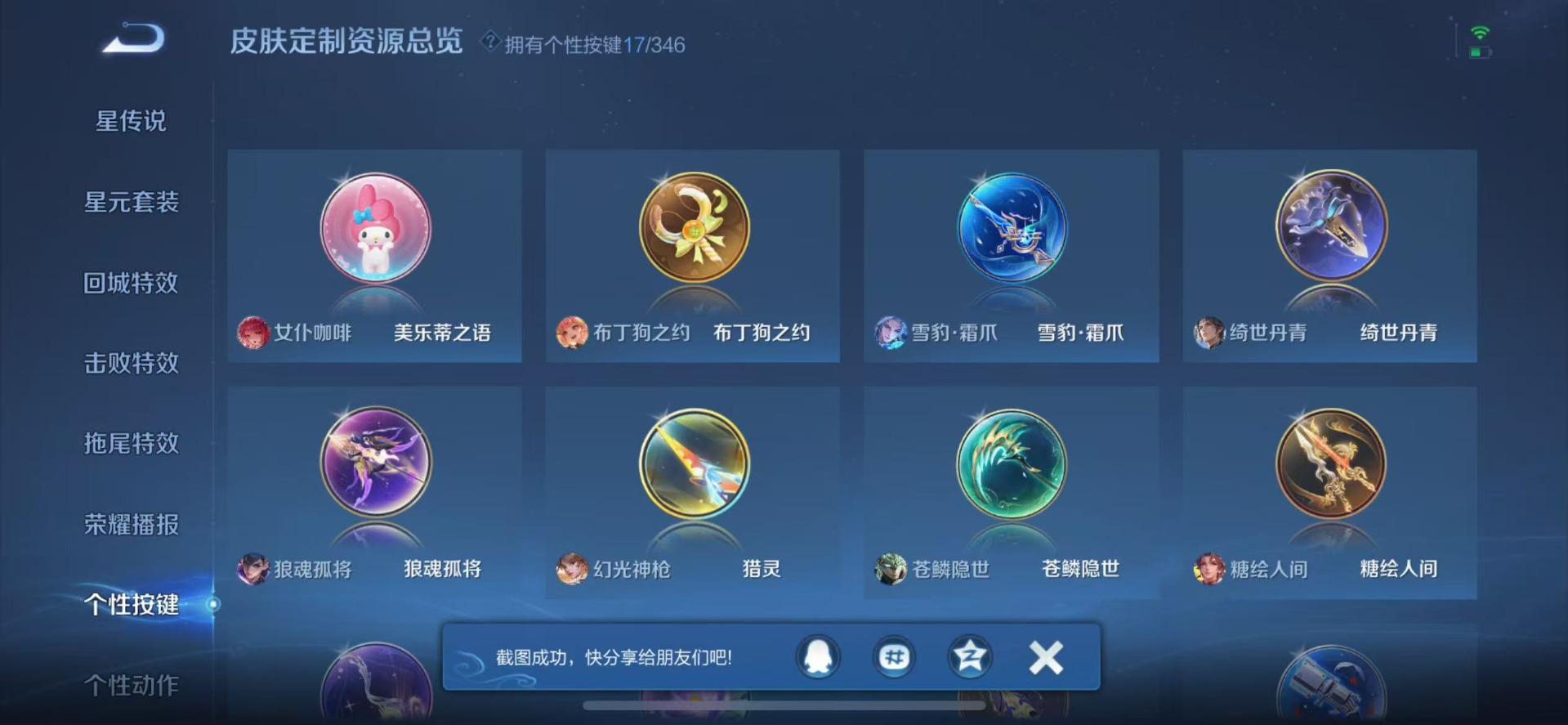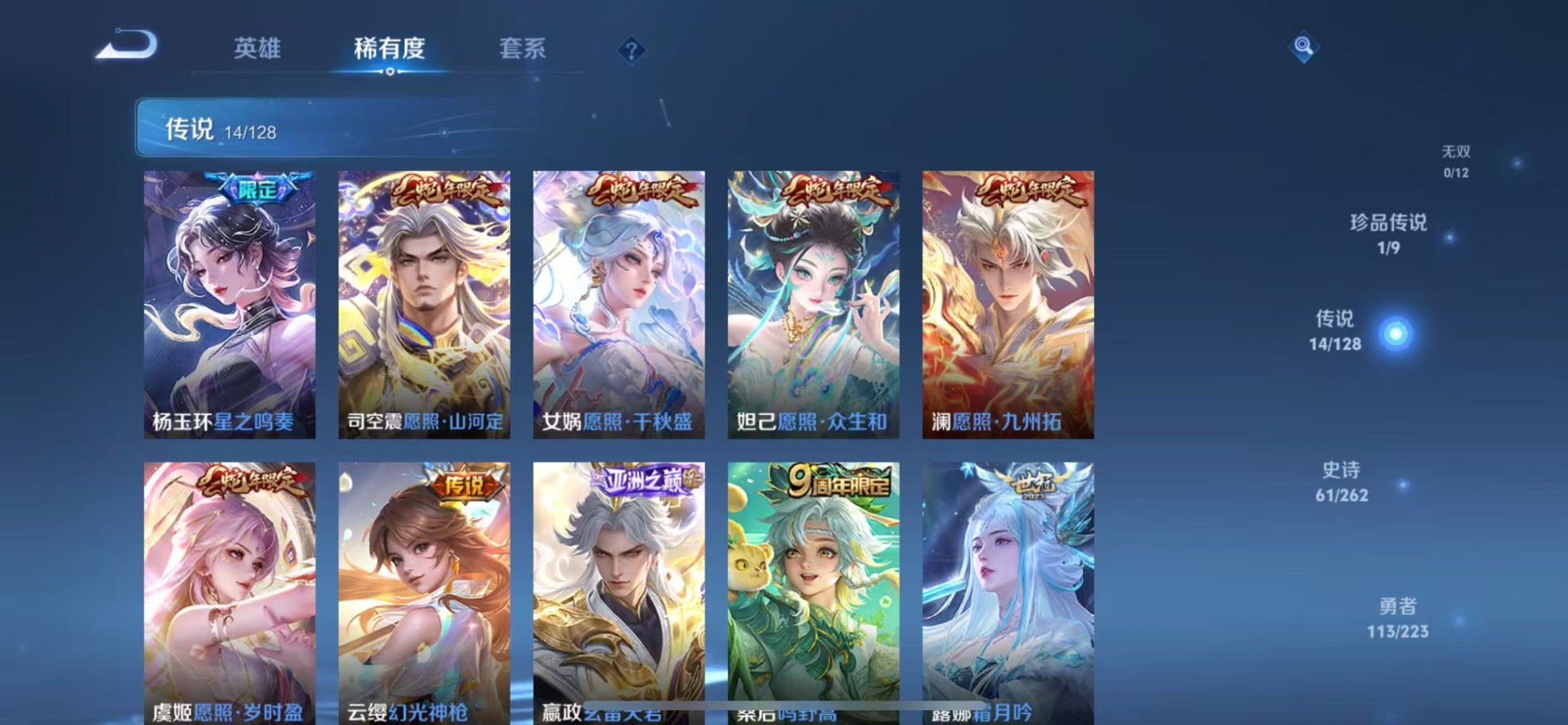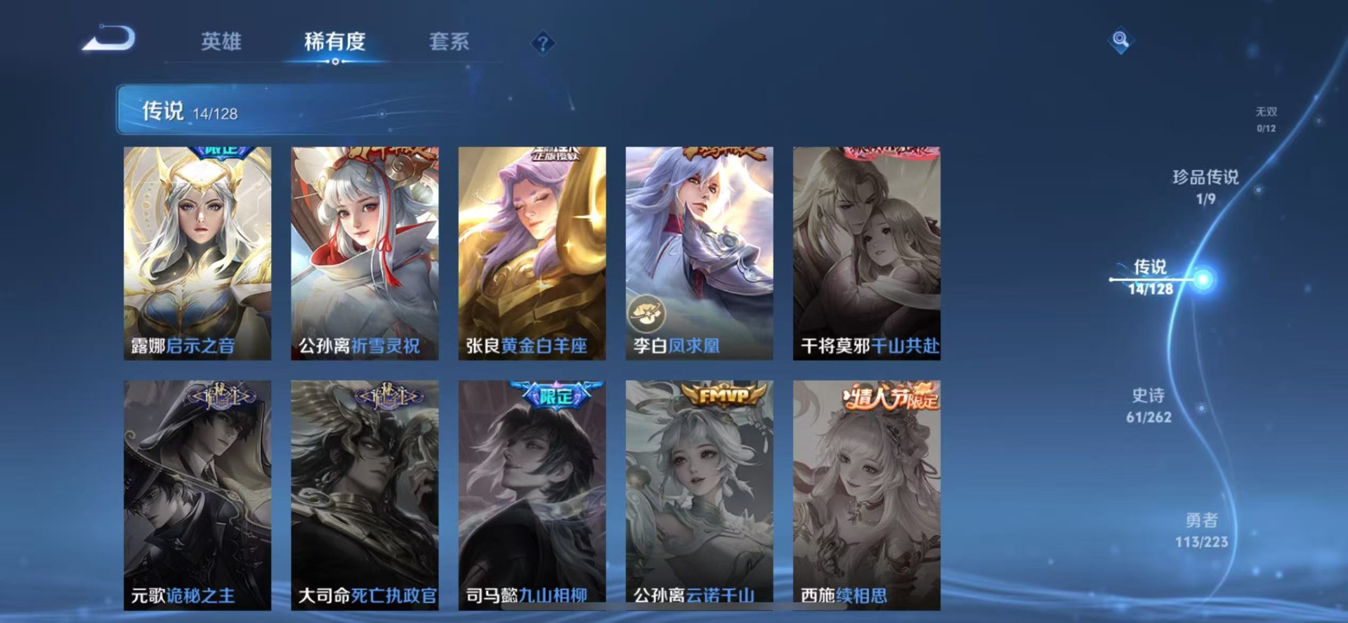 露娜启示之音,公孙离祈雪灵祝,司空震愿照·山河定,裴擒虎李小龙,上官婉儿梁祝,桑启鸣野蒿,女娲愿照·千秋盛,妲己愿照·众生和,韩信飞衡,澜愿照·九州拓,虞姬愿照·岁时盈